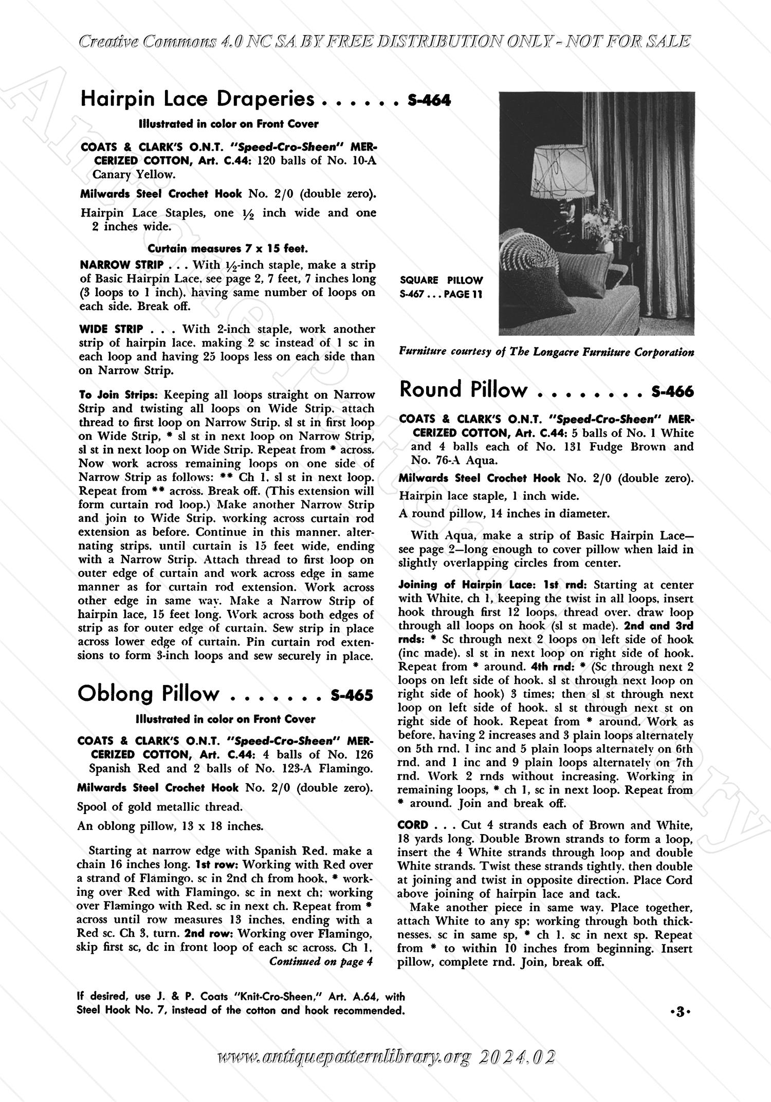 16 pages stapled booklet, First Edition 154-H-3744, copyright 1954. How to make basic hairpin lace, S-464 Hairpin Lace Draperies, S-465 Oblong Pillow (hairpin), S-466 Round Pillow (hairpin), S-467 Square Pillow (crochet), S-468 Hairpin Lace Chair Set, S-469 Hairpin Lace Chair Set, S-470 Bottle Cap Place Mat and Hot Place Set (crochet), S-471 Pineapple Mat (crochet), S-472 Hairpin Lace Café Curtains, S-473 Round Hairpin Lace Place Mat, S-474 Oval Hairpin Lace Place Mat, S-475 Checkered Motif Place Mat (hairpin), S-476 Hairpin Lace Place Mat, S-477 Hairpin Lace Place Mat, S-478 Lover's knot lampshade (crochet), S-479 Hairpin Lace Lamp Shade Cover, S-480 Motif Lamp Shade Cover (crochet), S-481 Rose Towel (huck), S-482 Yellow Place Mat (huck), S-483 Blue Apron (huck), S-484 Grey Place Mat (huck), S-485 Wine Pillow (huck), S-486 Green Towel (huck). W A R N I N G : use metal bottlecaps, not plastic, for S-470 and S-471.