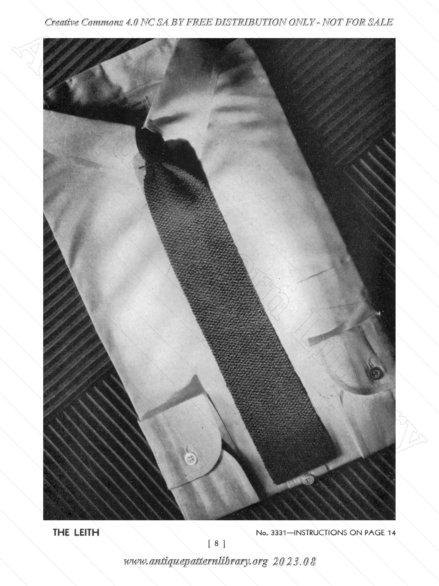 Softcover stapled booklet, 16 pages including covers. Nine pages photographs of men with neckties, or folded shirts with neckties, and a tenth on the front. Five pages with patterns for these neckties. One is knitted, the other all crocheted.