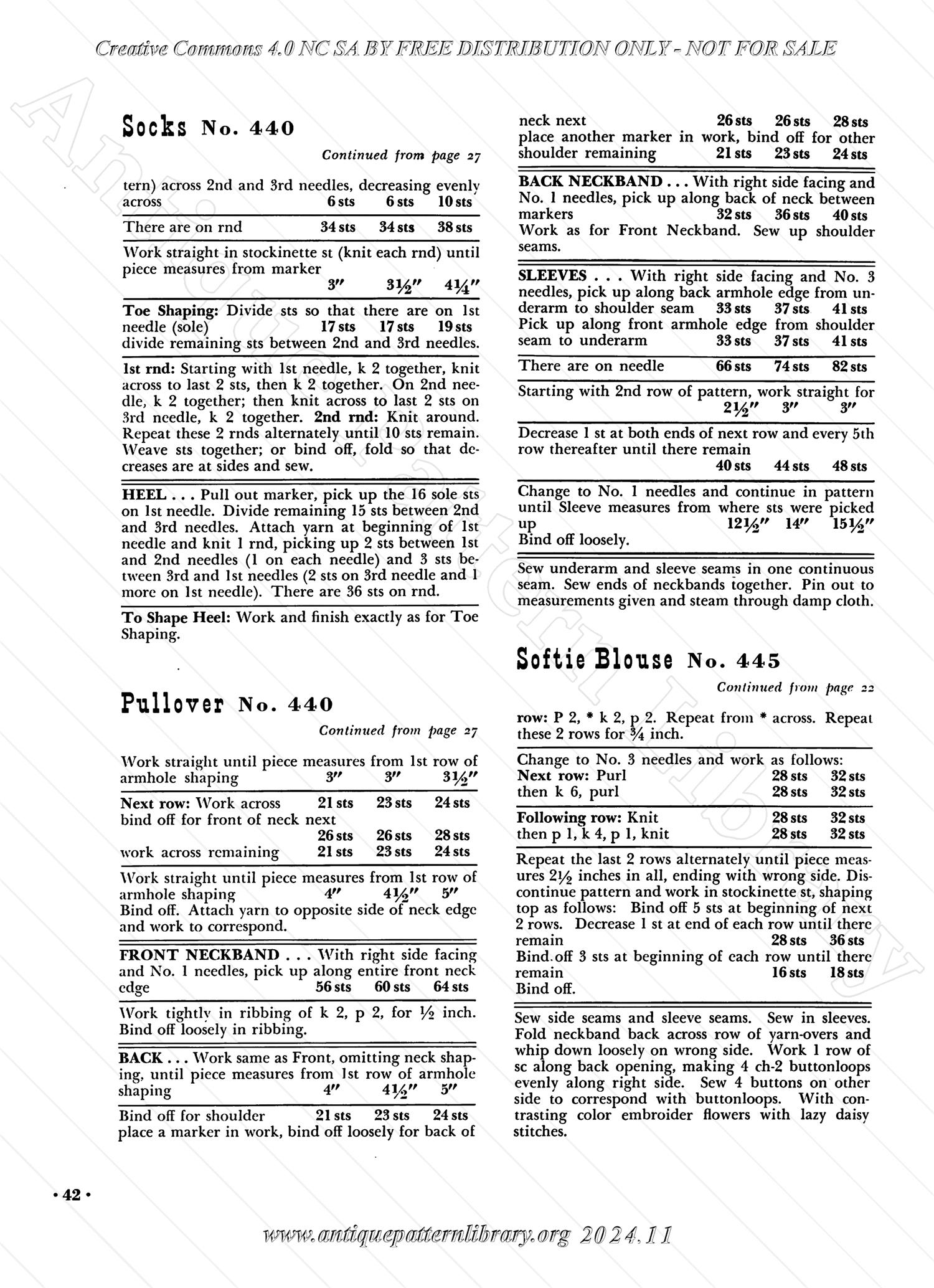 Stapled softcover, 48 pages and an inlaid slip of paper about yarn shortage during the war. Second edition, must have been a popular pattern book. Nostalgic photographs of children wearing the knitted garments. Patterns are named and numbered, with the possible sizes indicated. No. 444 Regular Guy (boys cardigan) 4/6, No. 437 Teachers Pet (girls cardigan) 2/4/6, No. 433 Yankee Dandies (both, striped short-sleeved sweater) 2/4/6, No. 503 Miss Glamour (girls pullover and cardigan) 2/4/6, No. 504 Sonny Boy (boys sweater) 2/4/6, No. 436 Peter and Anne (both, jacket and cap) 2/4/6, No. 439 Jumper Pet (girls dress) 2/4/6, No. 501 William Tell Jr (boys pullover) 4/6, No. 443 Daddy's Darling (girls top with ruffles) 4/6, No. 445 Softie Blouse (girls embroidered blouse) 2/4, No. 459 Daisy-Belle (girls embroidered scarf), No. 460 Nifty Beanie and Mittens (girls), No. 507 John and Betty (both, gloves, mittens, scarf, bonnet) 3/4/5, No. 440 Peter and Carol (both, pullover 2/4/6 and short and kneelength socks 6/7/8), No. 502 Sweetie Pie (girls yoke dress) 2/4, No. 442 Simplicity (girls cardigan) 4/6, No. 506 Turnabout Twins (both, long-sleeved vests) 2/4/6, No. 435 Jack and Jill (both, skirt, pants, both with suspenders and crossband) 2/4/6, No. 505 Early Snowflake (girls sweater) 2/4