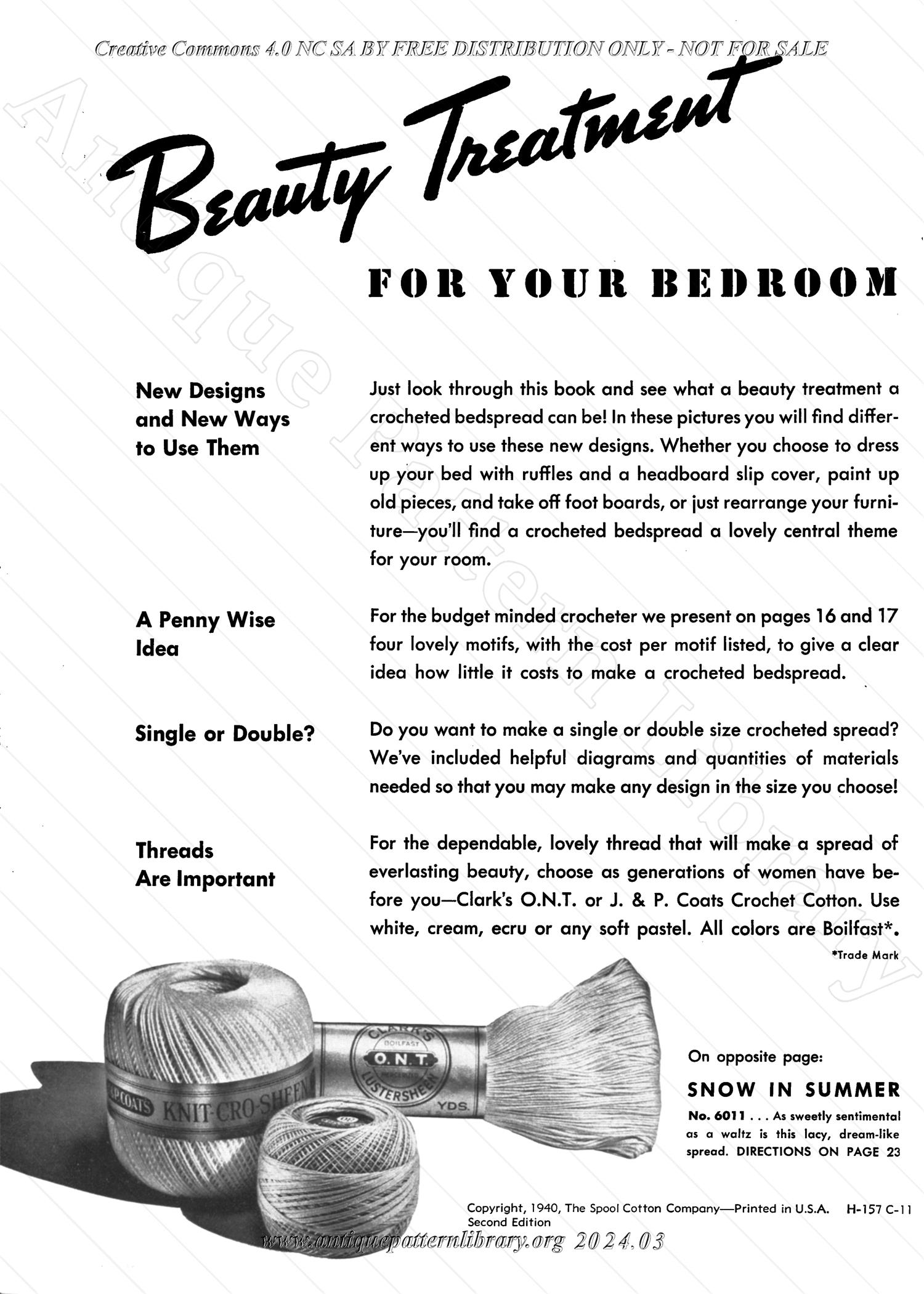 Softcover stapled booklet of 32 pages. Eighteen bedspread patterns, varying from filet crochet to Irish crochet, with calculations of how many motifs you would need and what the cost would be. Charming illustrations of bedrooms with these bedspreads. List of patterns: 6020 Magnolia, 6011 Snow in Summer, 6017 Waltz Time, 675 Radiant Star, 6014 Rose of Killarney, 6019 Lovelace, 6025 Pine Cone, 6031 Trailing Vine, 6022 Hexagon, 6023 Circle, 6021 Classic, 6026 Square, 6015 Berkeley Square, 6018 Charmer, 681 Jenny Lind, 6013 Star Drift, 6016 Heirloom.