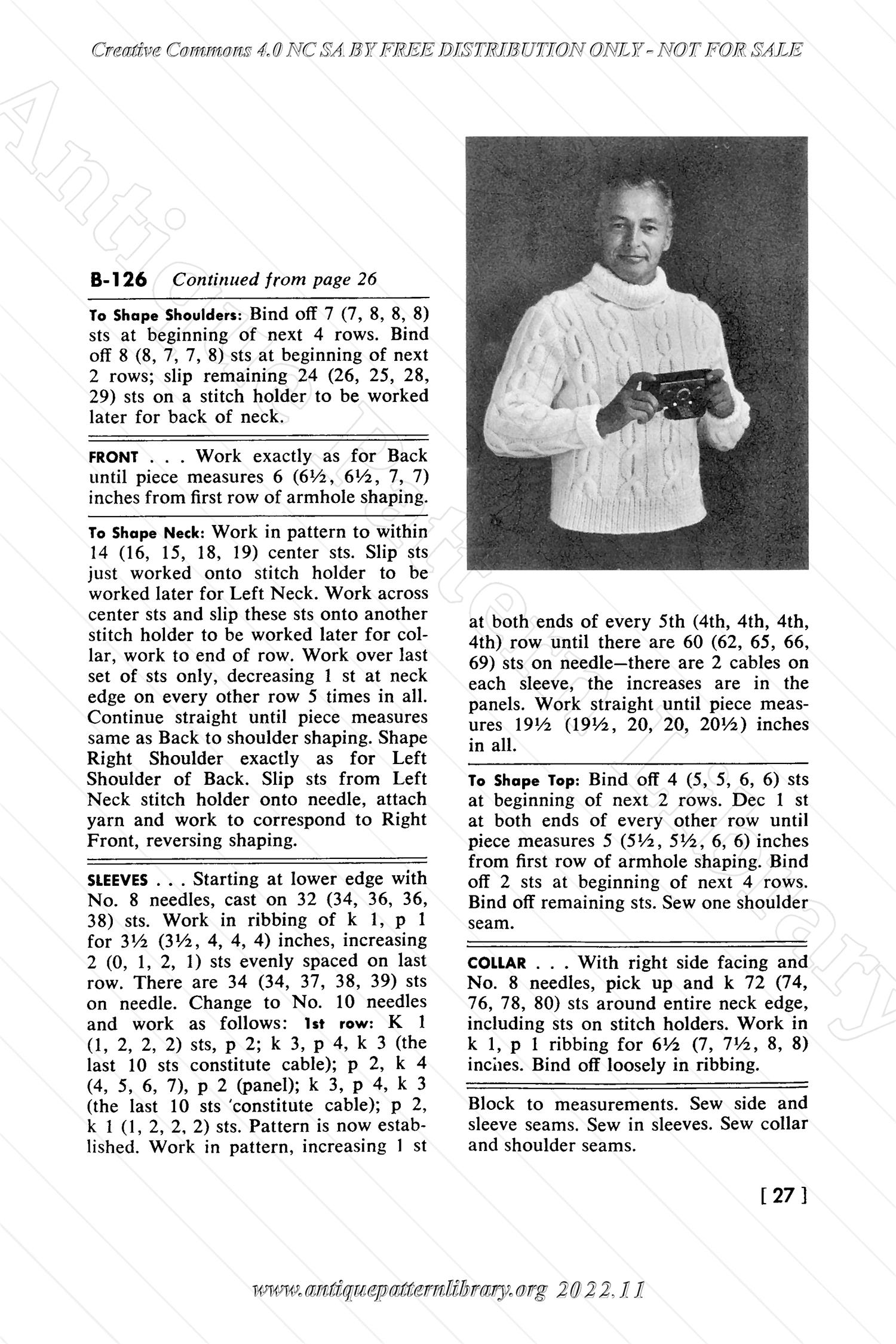 Small stapled softcover, 36 pages including covers. Patterns B-115 to B-128. Mostly cable sweaters, pullovers, cardigans, vests, but also a pair of mittens and a hooded scarf.