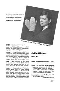 Small stapled softcover, 36 pages including covers. Patterns B-115 to B-128. Mostly cable sweaters, pullovers, cardigans, vests, but also a pair of mittens and a hooded scarf.