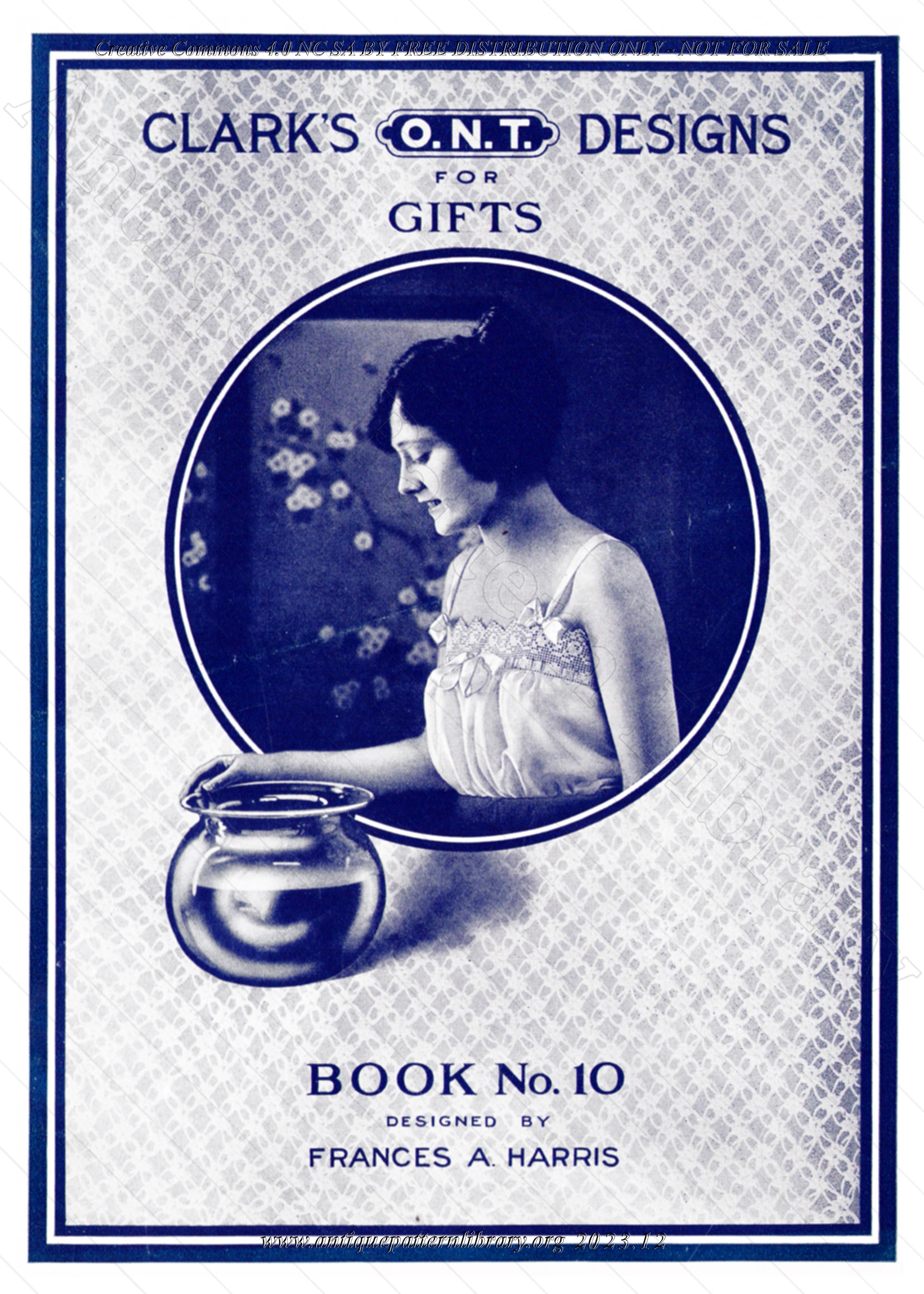 Softcover stapled booklet, 24 pages including covers, dated 1920. Mostly small crocheted items. Some require additional sewing such as caps, yokes, and cozies.Charts for the filet crochet patterns. The patterns are Alphabets, Butterfly Cap and Yoke, Cleopatra Bedspread and Pillow Scarf, Cosmos Bedspread and Pillow, Egg Cozy, Fichu, Gentleman's Scarf, Luncheon Set, Maid O' the Mist Bag, Monograms, Moss Rose Designs Collar and Laces, Motor Veil, Night Gown Case, Puff Ball, Rosalie Cap and Yoke, Rosebud Pattern Yoke, Tea Cozy, Vanity Case, Venetian Dresser Scarf, Scarf