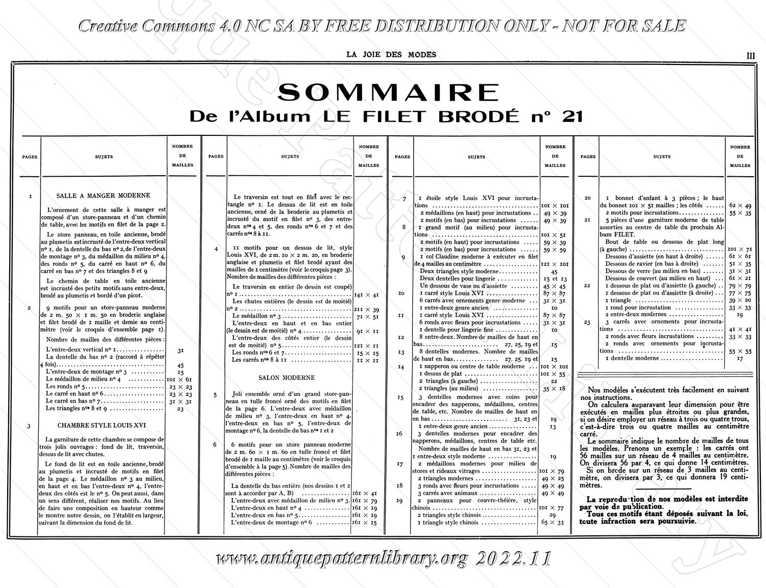 Large oblong softcover publication, 24 pages not including covers. No date given, probably 1920s. From the series Les Patrons Favoris. Mostly filet patterns, some whitework embroidery shown as well. The book is so wide that it's folded double, with the front and back cover both on the front page.