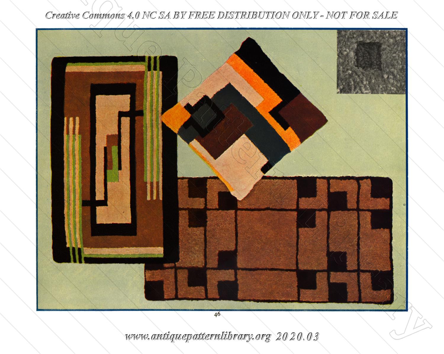 Cardboard cover, oblong, bound. 74 pages. Punchwork carpets, tablecovers, tea cosies, hat and jacket. Colored plates and pattern drawings.