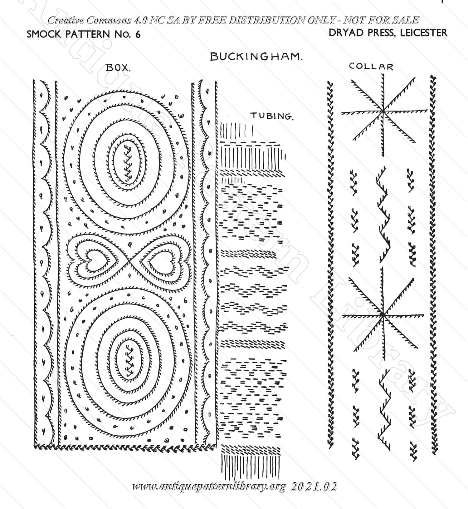 16 page stapled booklet, not counting the covers. Also six pages of illustrations in the center, and pattern sheets showing the decorative embroidery patterns. History of smocking in England and disappearance of the technique. Pattern of a smock, and instruction how traditionally the material was cut with least amount of waste. Colors, materials, stitches to be used, making up the smock. Some advertisements for other Dryad publications.