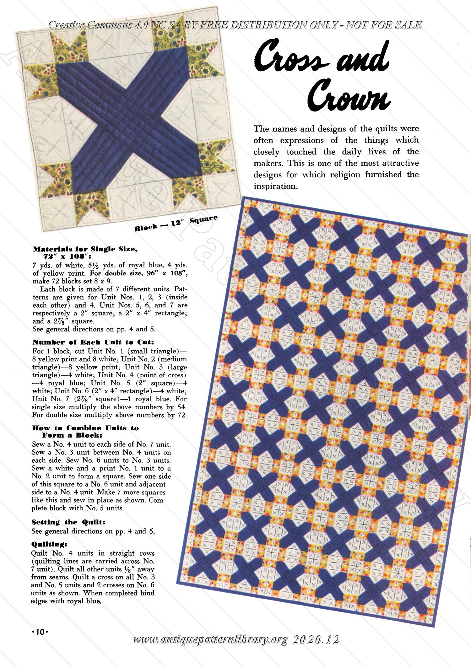 24 pages, stapled softcover. Pieced and appliquéd quilting patterns, actual size. How-to on sewing, pressing, and putting the quilt together. Yankee Pride, Mexican Cross, Star and Crescent, Cross and Crown, Roman Stripe, Harvest Sun, Ship's Wheel, Four Doves in a Window, President's Wreath, Rare Old Tulip, Rose of Sharon, Birds in the Air, Triple Sunflower.