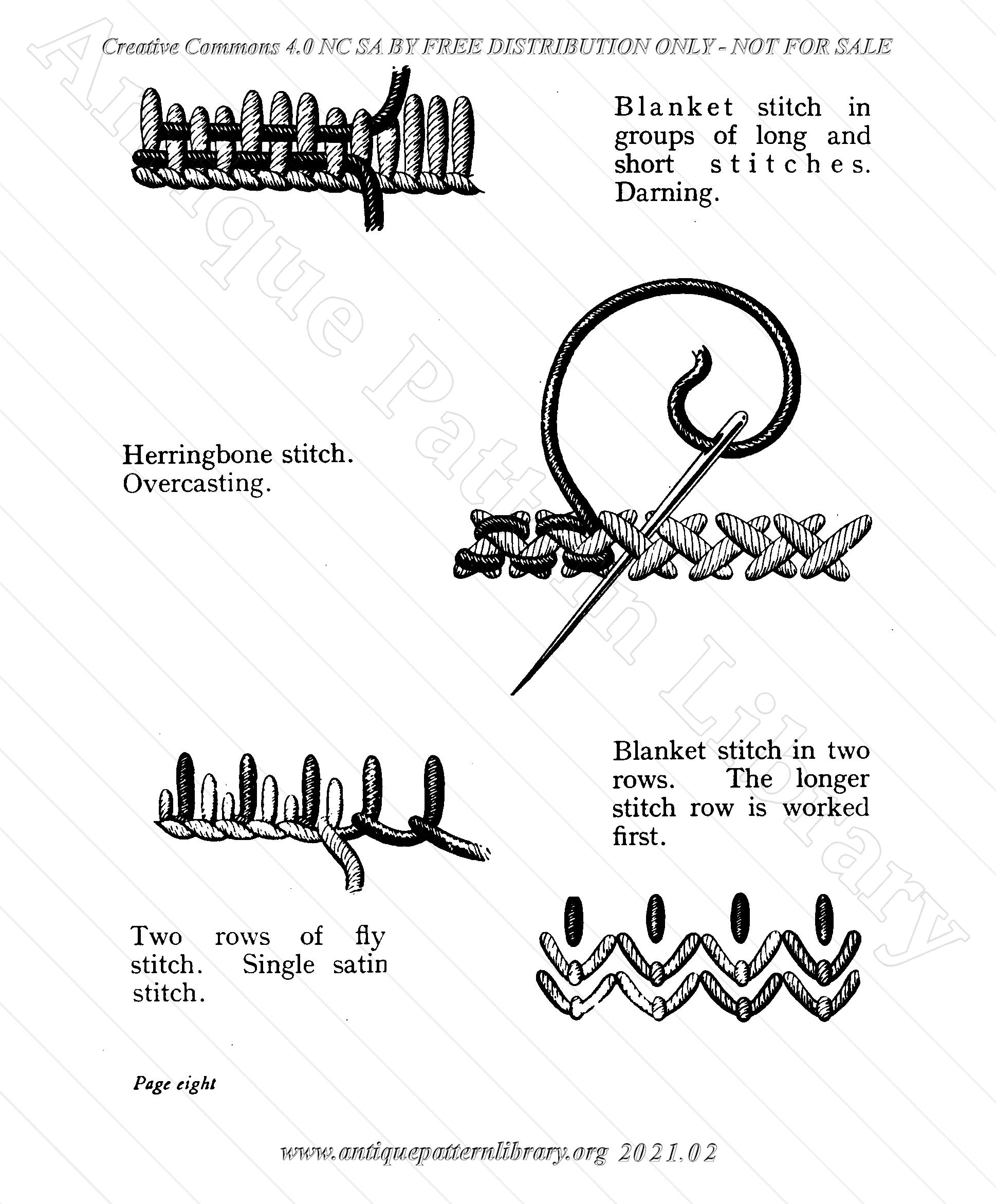 16 page stapled booklet, containing instructions for basic embroidery stitches. Bullion stitch, button stitch, chain stitch, couching, daisy stitch, darned blanket stitch, darning, feathering, fancy cord, finger cord, herringbone stitch, overcasting, fly stitch, satin stitch, french knots, knot stitch, long and short stitch, oriental stitch, seeding, snail trail, stem stitch, back stitch, twisted cord, weaving, zig zag chain stitch.Some combined stitches.