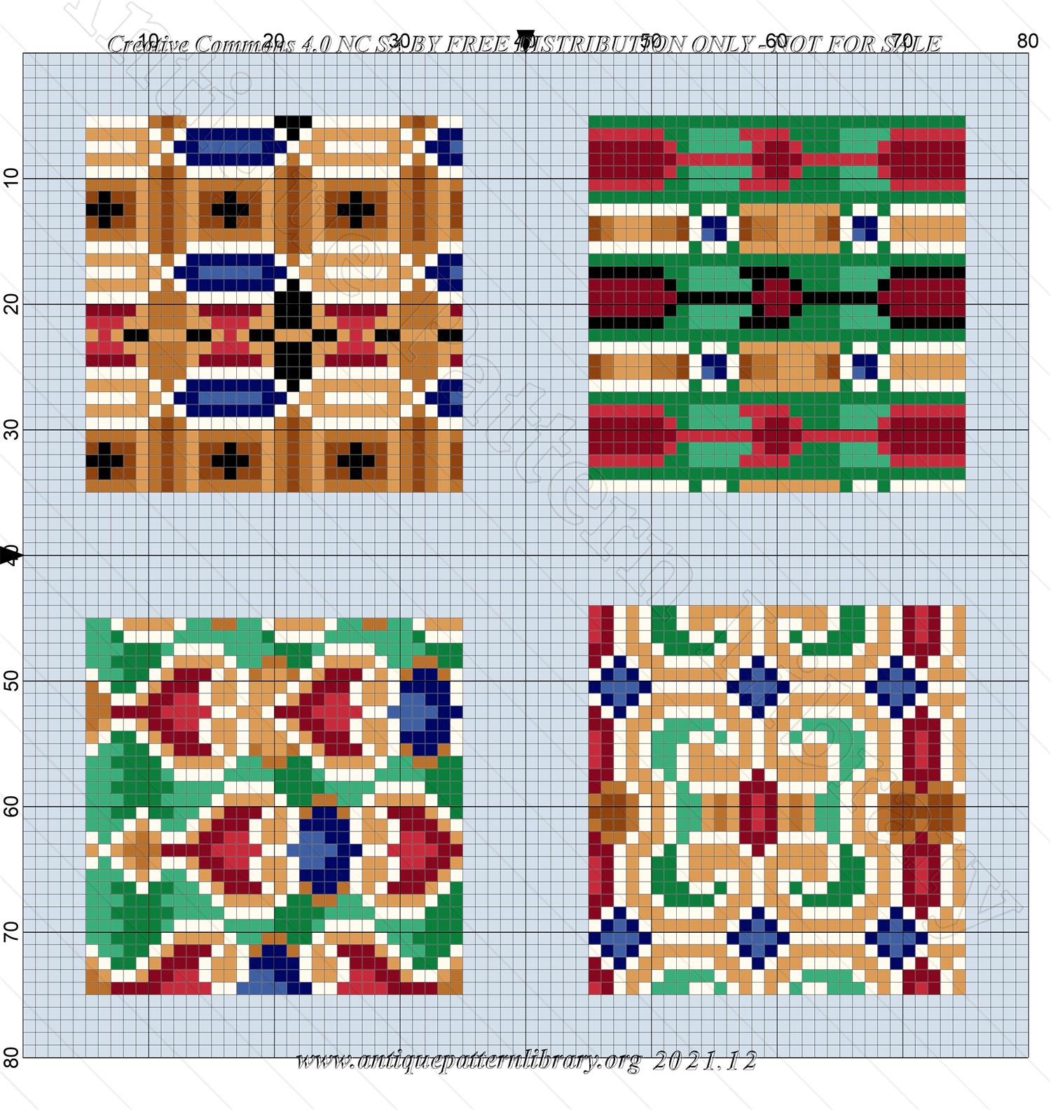 Four handpainted brightly colored repeating patterns on blue-gray cardboard. Individual squares are 30x30 stitches. The top left pattern is unfinished, the only complete part is top left within the pattern. Unfinished parts are still grey and show the underlying grid. The bottom right pattern is not a complete repeat. The bottom left pattern needs further study.