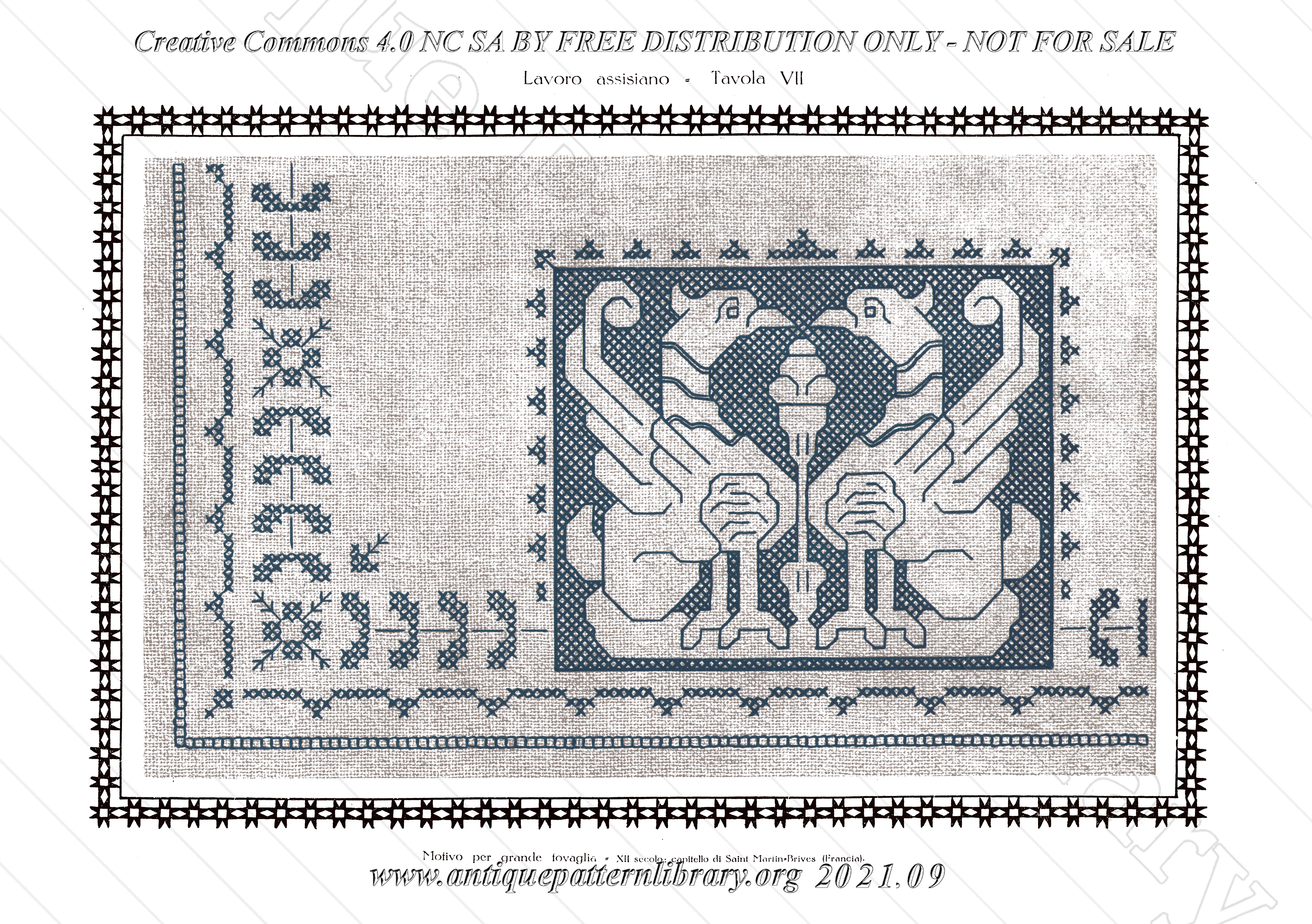 Oblong stapled softcover booklet. Cover, four text pages, 12 plates. Voided embroidery aka Assisi embroidery, small motifs, border designs and corner designs for tablecloths, towels and similar linens.