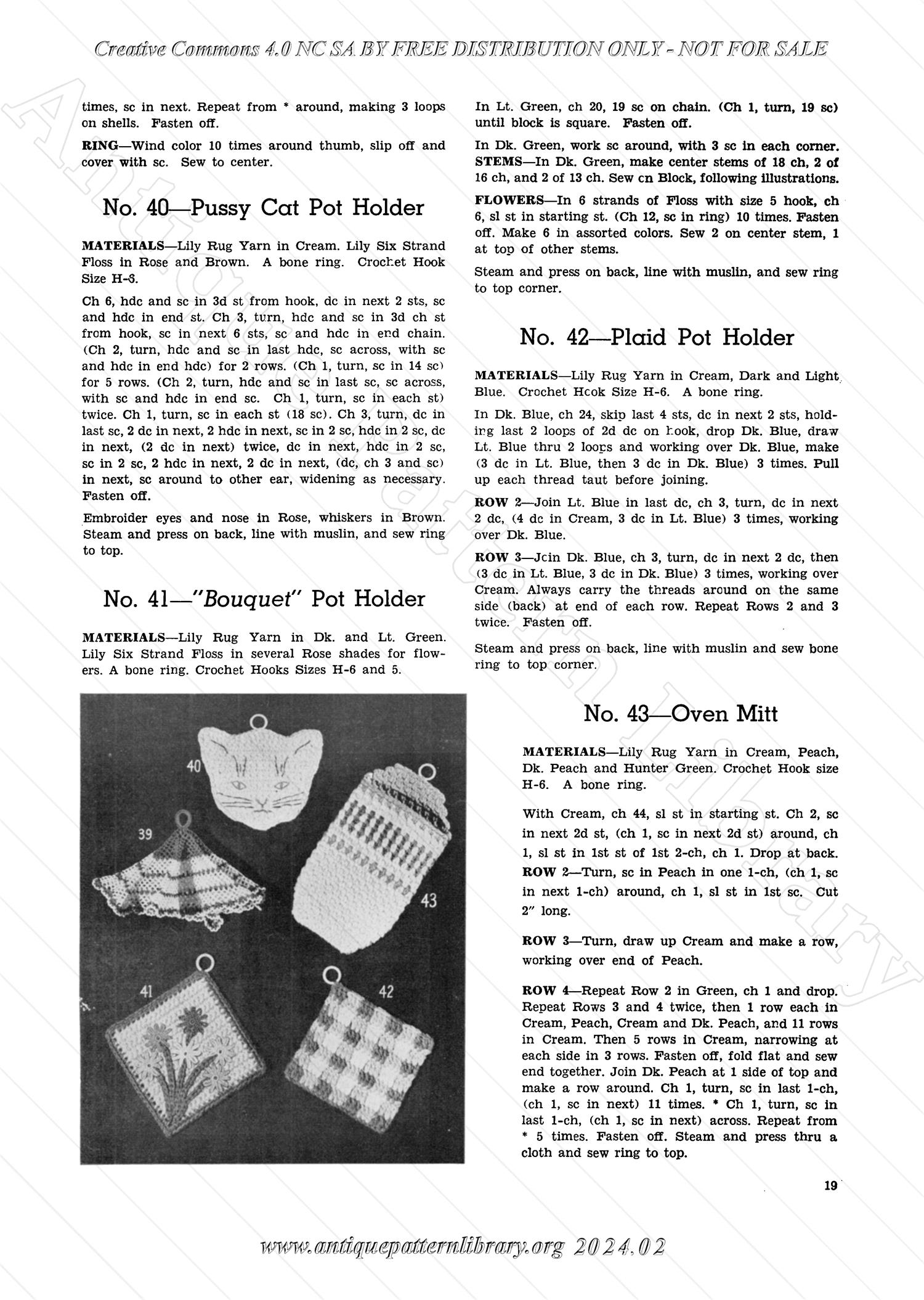 Table Scarf in Crochet Weaving for Entrance Hall Table, Crocheted Flower Basket "Hobnail" Design, Chair Set and Crocheted Work Basket, Rug in "Crocheted Needlepoint", Foot Stool in Crocheted Needlepoint, Crocheted Medaillion for Bedspread "Greek Key" Design, Crocheted Bedspread Design "Jungle Leaves", Doilies for Dressing Table, Dressing Table Set "Water Lily Design" (lampshade, trinket tray, jewel box), Bedroom Rug and Slippers in "Crocheted Weaving", Crocheted Medallion Tablecloth, Crocheted Medallion "Fantasy", Crocheted Medallion "Square Dance", Crocheted Medallion "Bright Star", "Patriotic" Place Mat in "Crocheted Weaving", Doily in "Crocheted Needlepoint", Woven Doily, "Banana Leaf" Tray set, Crocheted Flower Basket, Tray Doily, Hostess Set "Fans Across The Border" (apron, luncheon set, glass muffs), Patio Set, Patio Flower Dish, No. 20 Crocheted Rope Dish Mats, No. 21 "Summer Garden" Hot Dish Mat Set, No. 22 Glover Leaf Coasters, "Rainbow" Table Doily, Crocheted Fruit Dish, No. 36 Tie Back, No. 37 Tie Back, No. 38 Tie Back & Napkin Ring In "Crocheted Needlepoint", No. 39 Dish Mat, No. 40 Pussy Cat Pot Holder, No. 41 "Bouquet" Pot Holder, No. 42 Plaid Pot Holder, No. 43 Oven Mitt, "Duck Family" Rug, "Peter and Susie" Bib, "Peter" the "Snuggle Bunny", Bathroom Set in Chenille: Rug and Seat Cover "Romance Design", Shower Bath Soap Bag, Terms and Explanation of Stitches