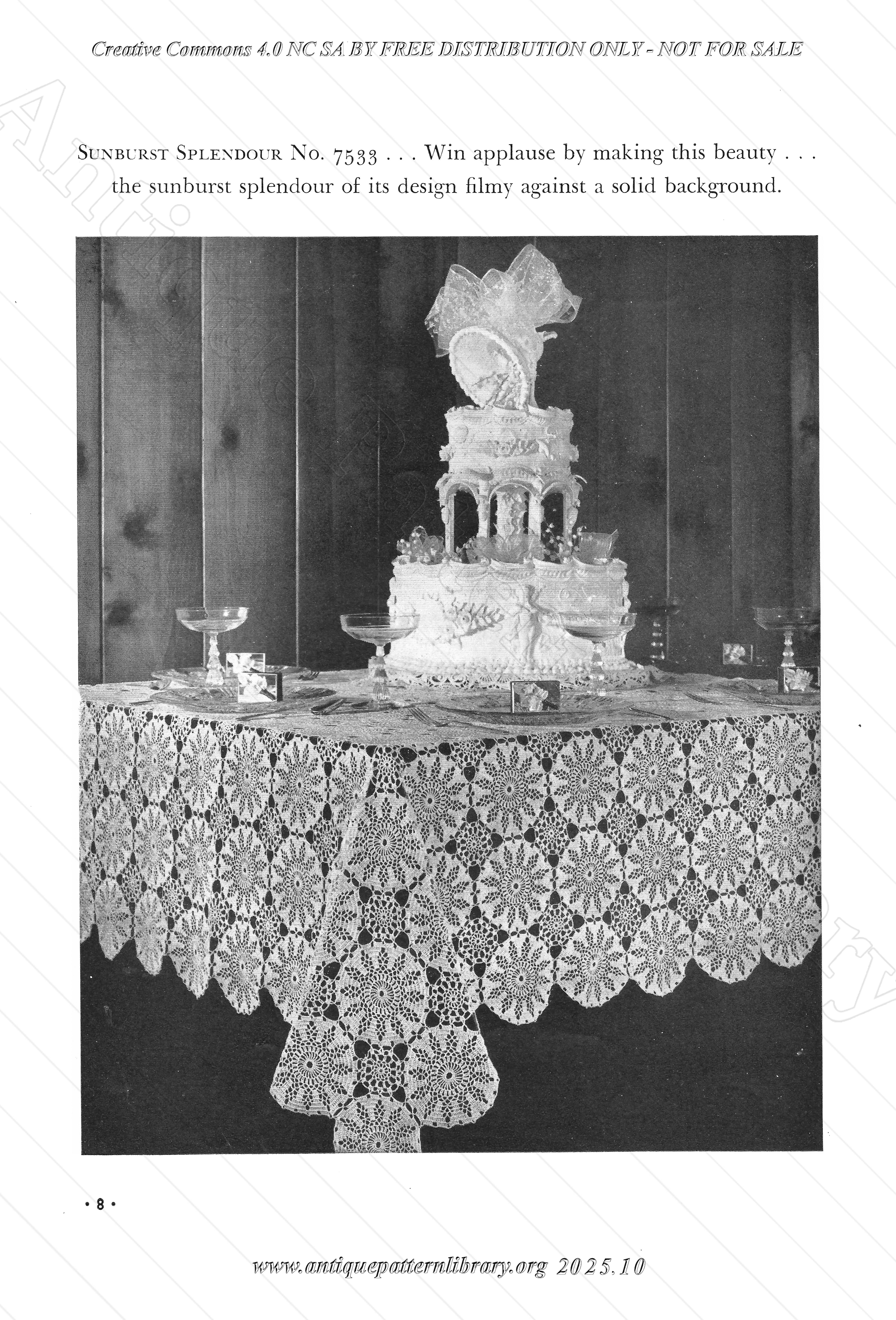 Crocheted tablecloths and other table linens. No. 7530 Summer Snowflake, 7584 Iris Arrangement (filet crochet), 7526 Page Polka Dots, 7533 Sunburst Splendour, 7558 Spinning Wheel, 7588 Spring Fantasy, 7554 Good Companions (tiny doilies), 7587 Country Cousin (luncheon set), 7486 Memory Lane (Irish Crochet), 7592 Salute to the Pineapple, 7592-M Presto, 7591 Flower Fable, 7531 Today's Heritage (filet crochet), 7525 Four Leaf Clover, 7485 Early American, 7586 At Your Service! (tray cloth), 7529 Trailing Vine (filet crochet), 7585 Lady Bountiful, 7583 Martha Washington.