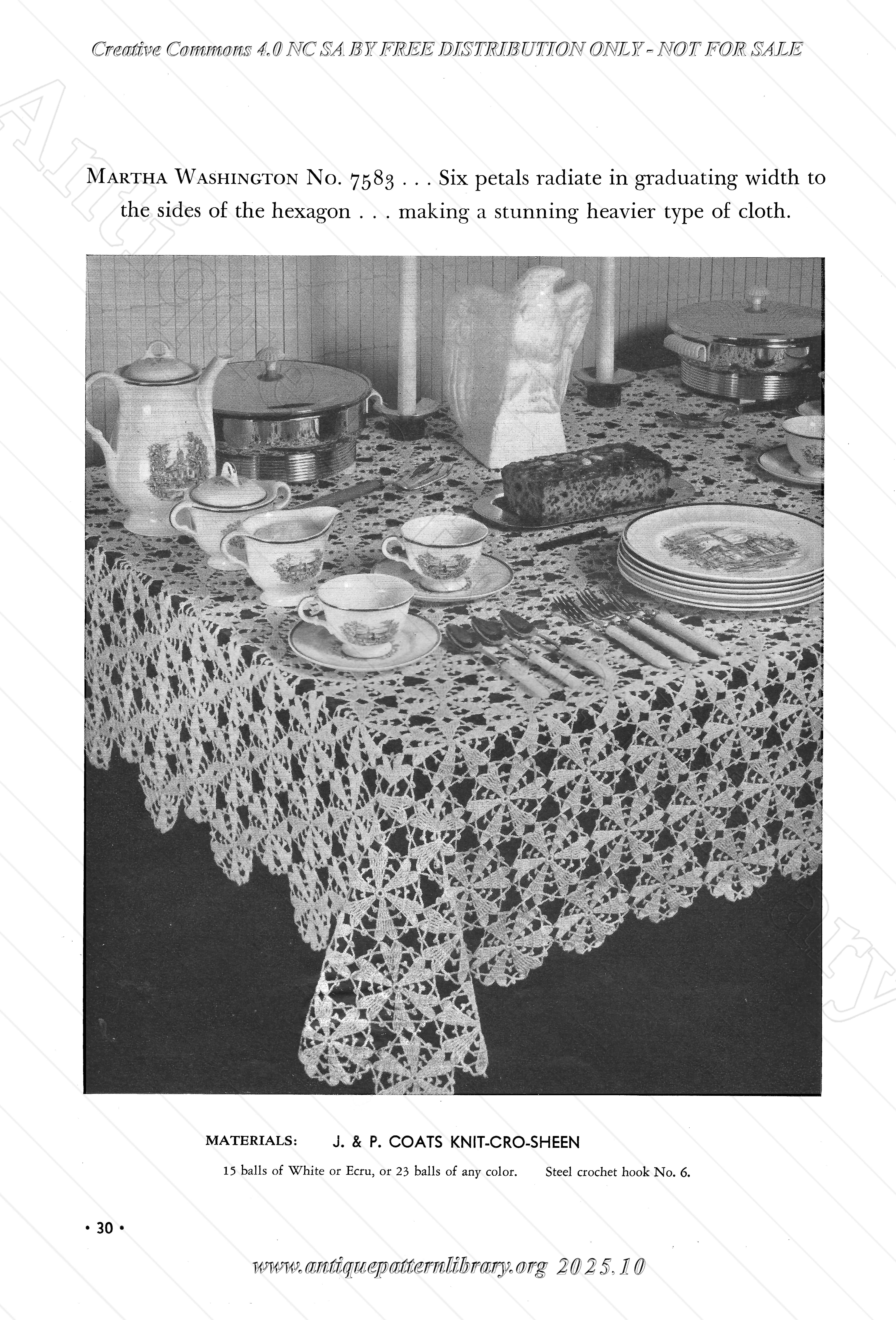 Crocheted tablecloths and other table linens. No. 7530 Summer Snowflake, 7584 Iris Arrangement (filet crochet), 7526 Page Polka Dots, 7533 Sunburst Splendour, 7558 Spinning Wheel, 7588 Spring Fantasy, 7554 Good Companions (tiny doilies), 7587 Country Cousin (luncheon set), 7486 Memory Lane (Irish Crochet), 7592 Salute to the Pineapple, 7592-M Presto, 7591 Flower Fable, 7531 Today's Heritage (filet crochet), 7525 Four Leaf Clover, 7485 Early American, 7586 At Your Service! (tray cloth), 7529 Trailing Vine (filet crochet), 7585 Lady Bountiful, 7583 Martha Washington.