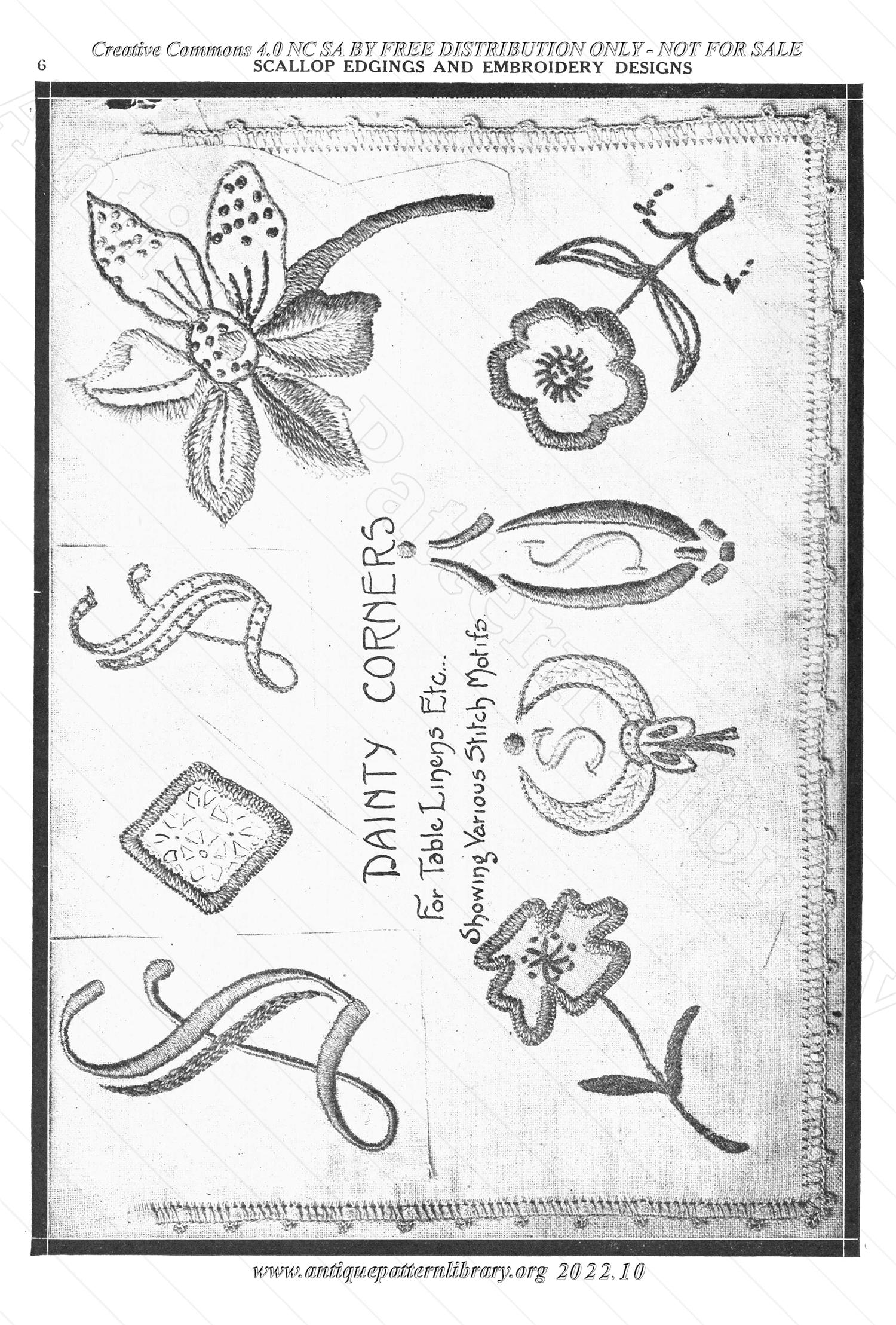Softcover booklet, 16 pages, about embroidery stitches and how to make your own perforated patterns, and crocheted decorations added to scalloped fabric edgings. Hat trimmings made of yarn and several perforated pattern designs.