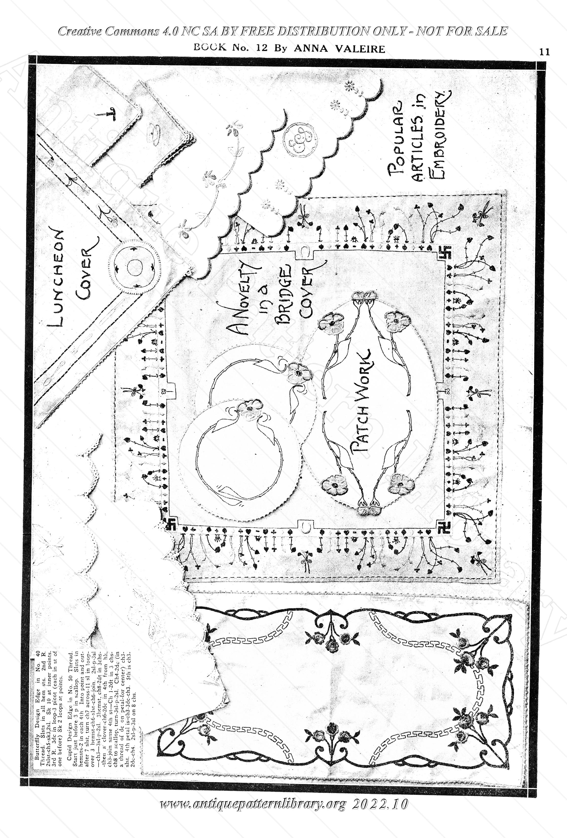 Softcover booklet, 16 pages, about embroidery stitches and how to make your own perforated patterns, and crocheted decorations added to scalloped fabric edgings. Hat trimmings made of yarn and several perforated pattern designs.