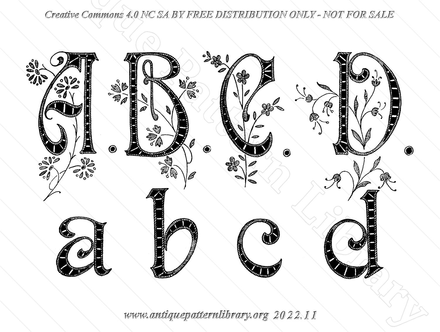 12 pages including covers. Contains a full alphabet in upper- and lowercase in open-work embroidery. The upper case letters have additional embroidered decorations of flowers and leaves. One size only, but can of course be scaled to desired size. Publication date unknown, probably early 1920s