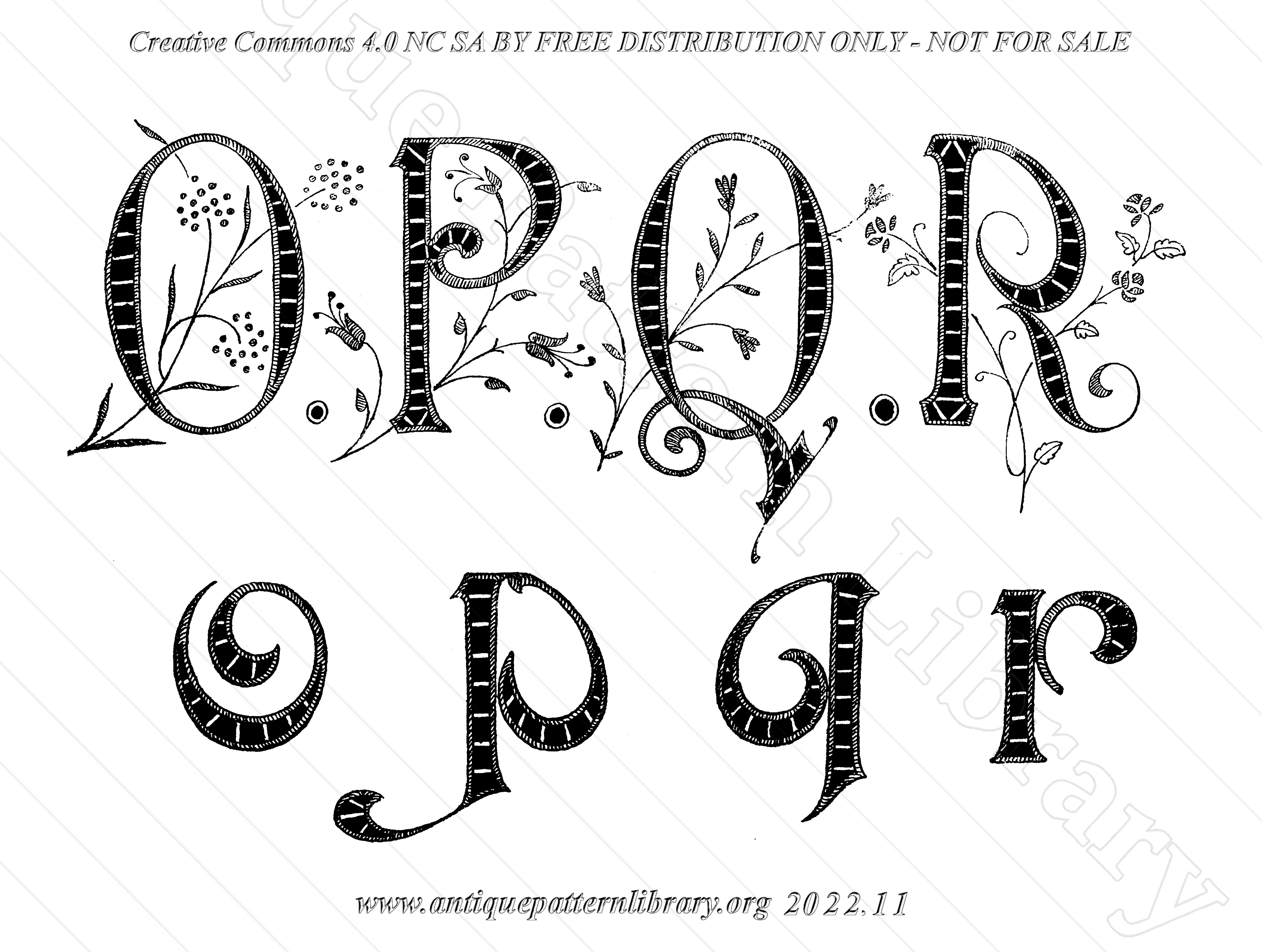 12 pages including covers. Contains a full alphabet in upper- and lowercase in open-work embroidery. The upper case letters have additional embroidered decorations of flowers and leaves. One size only, but can of course be scaled to desired size. Publication date unknown, probably early 1920s
