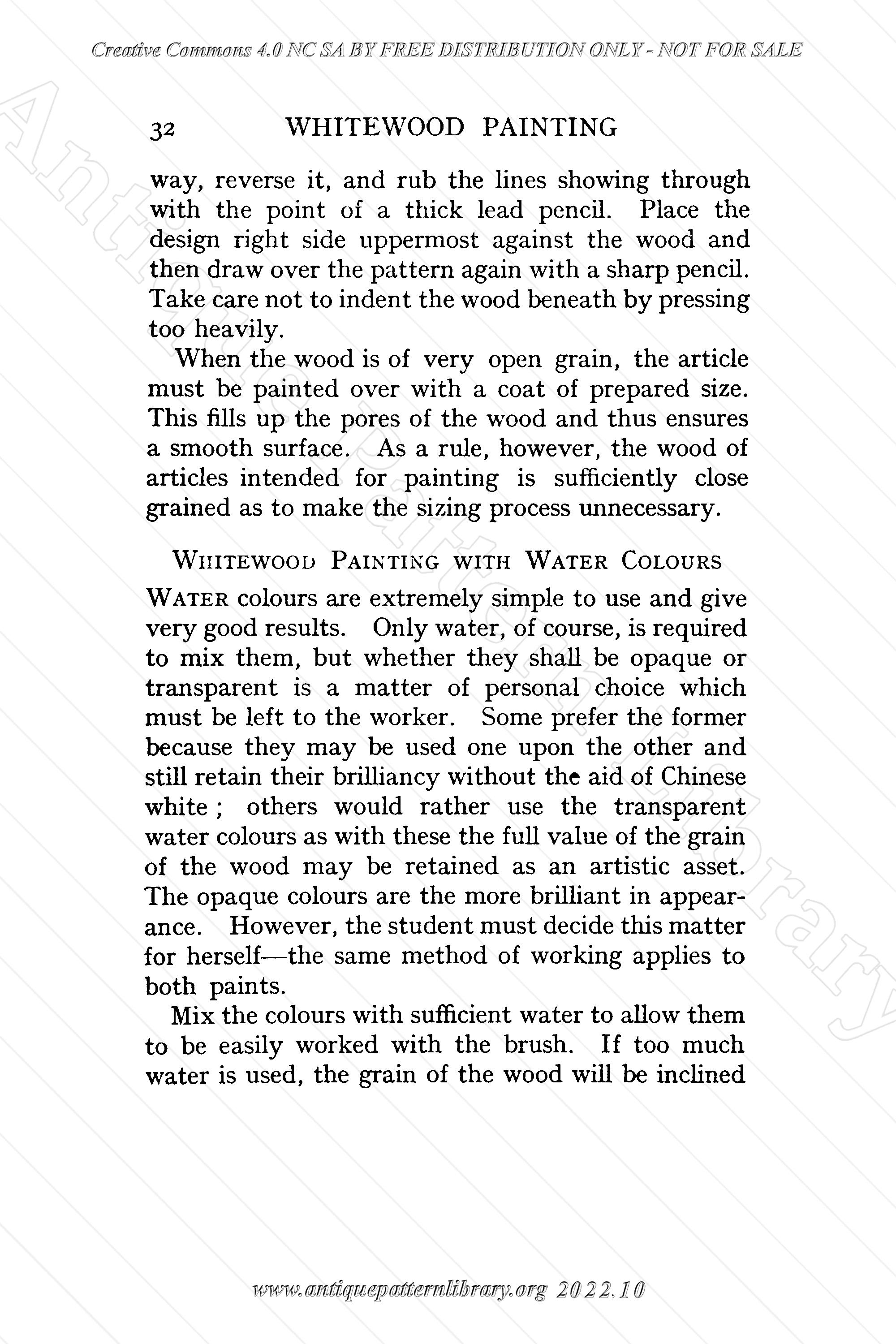 Small hardcover book, 64 numbered pages, and four pages of advertisements at front and back. Last page of list of contents has number v, should be iv. Stencil materials, techniques, some designs. Whitewood painting is similarly described. Barbola work is 3D modeling in a sort of paste, the author gives hints on how to make flowers and leaves. Painting on glass describes painting with enamel and similar paints, not painting with glass paint that has to be fired to be fixed on the glass.