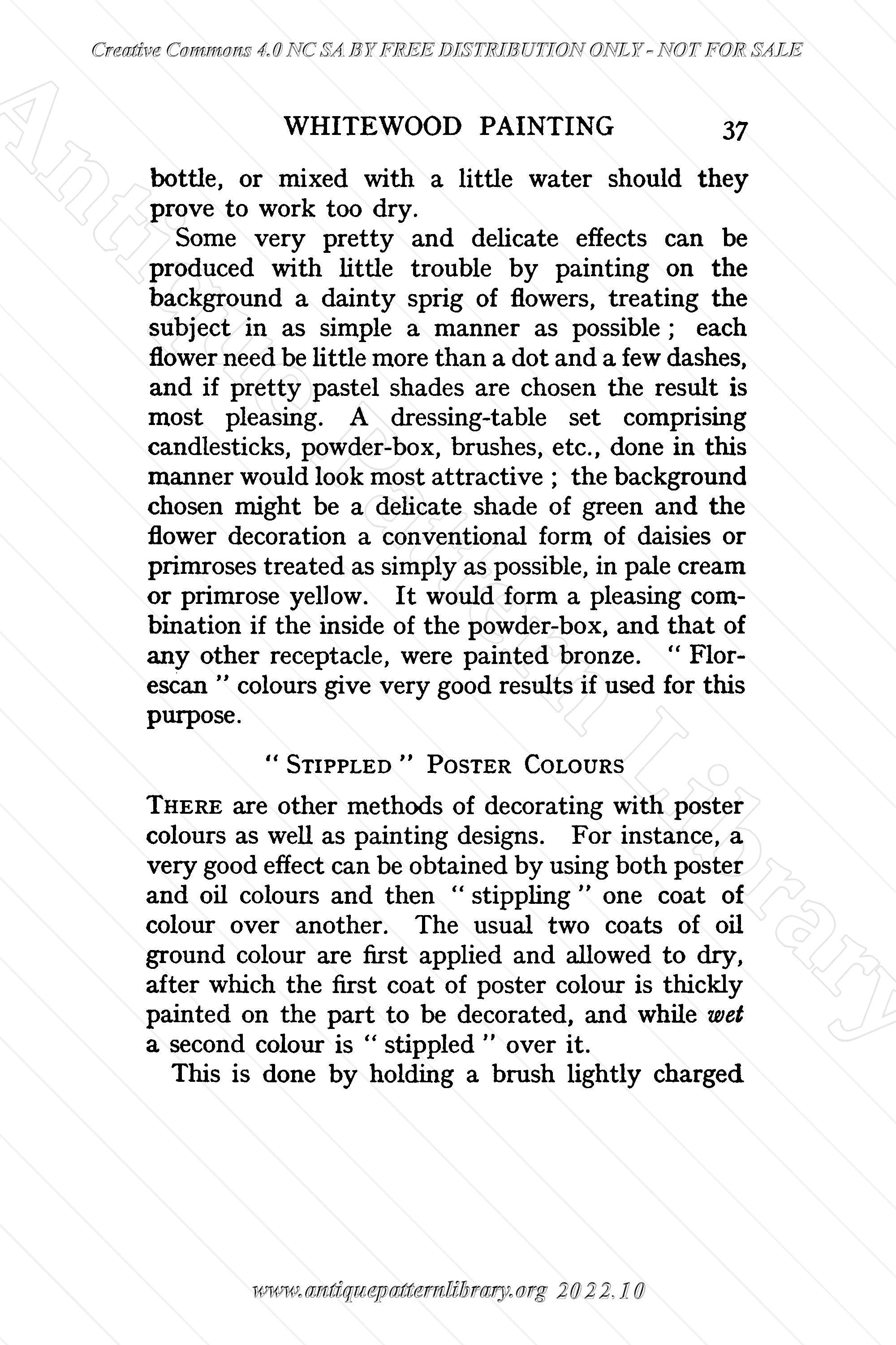 Small hardcover book, 64 numbered pages, and four pages of advertisements at front and back. Last page of list of contents has number v, should be iv. Stencil materials, techniques, some designs. Whitewood painting is similarly described. Barbola work is 3D modeling in a sort of paste, the author gives hints on how to make flowers and leaves. Painting on glass describes painting with enamel and similar paints, not painting with glass paint that has to be fired to be fixed on the glass.