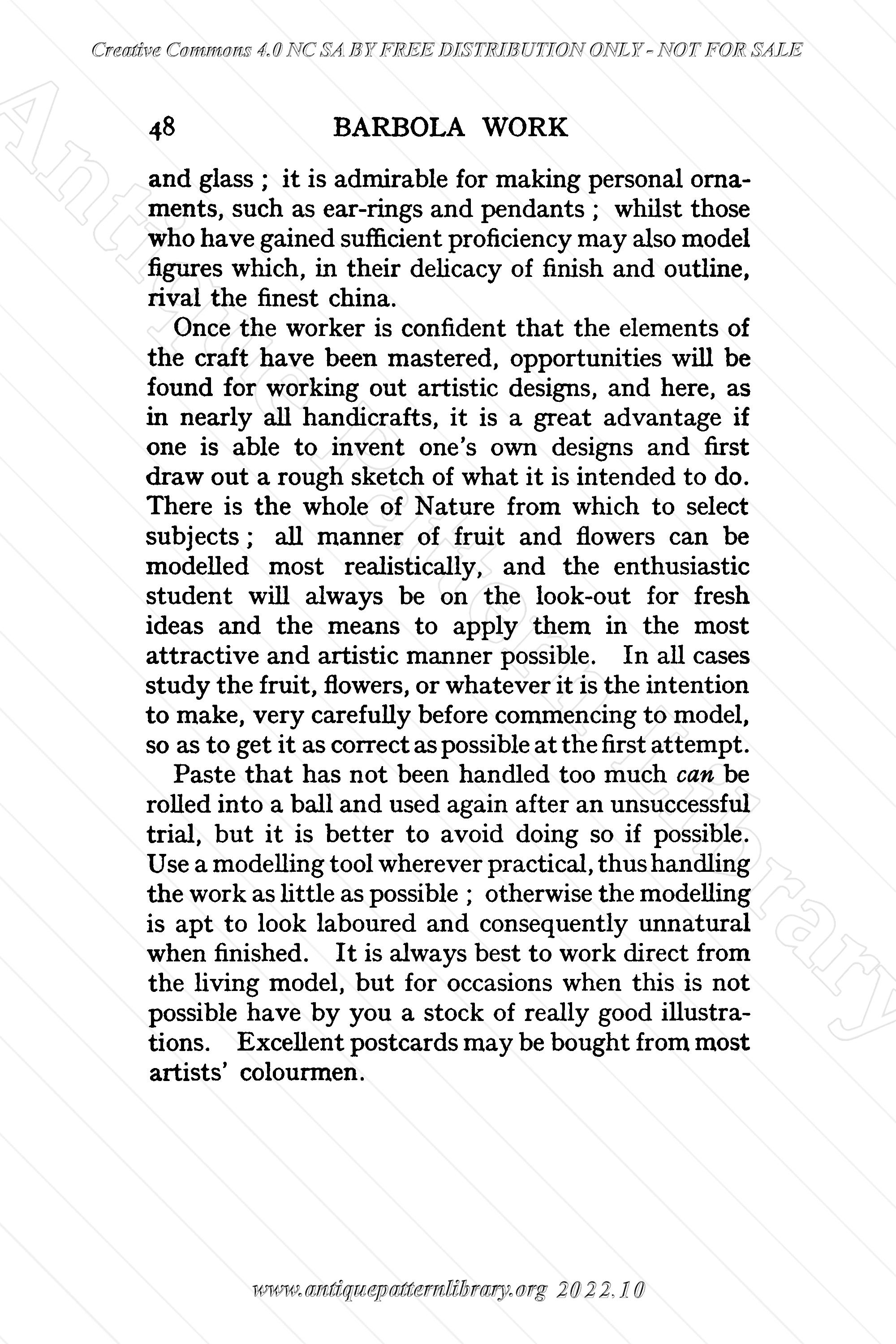 Small hardcover book, 64 numbered pages, and four pages of advertisements at front and back. Last page of list of contents has number v, should be iv. Stencil materials, techniques, some designs. Whitewood painting is similarly described. Barbola work is 3D modeling in a sort of paste, the author gives hints on how to make flowers and leaves. Painting on glass describes painting with enamel and similar paints, not painting with glass paint that has to be fired to be fixed on the glass.
