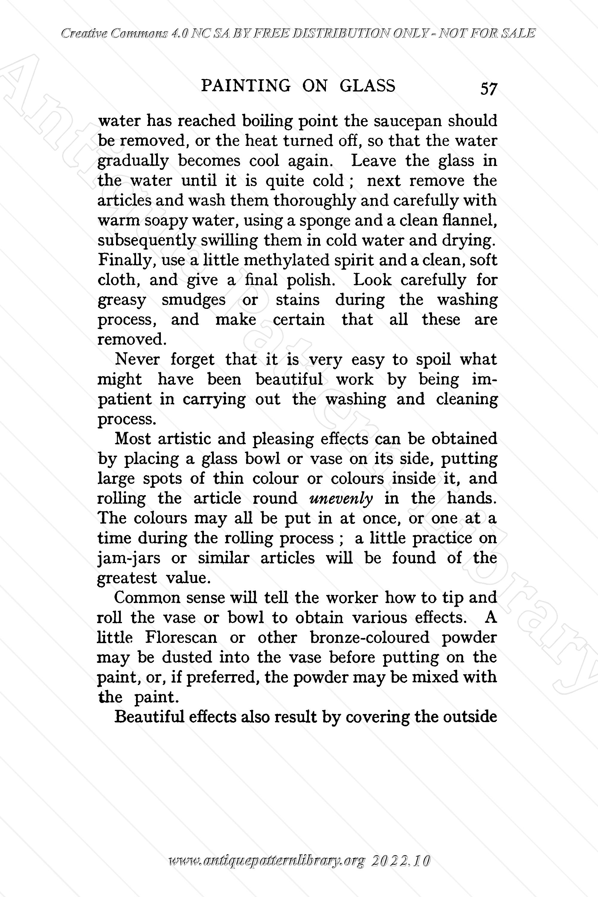 Small hardcover book, 64 numbered pages, and four pages of advertisements at front and back. Last page of list of contents has number v, should be iv. Stencil materials, techniques, some designs. Whitewood painting is similarly described. Barbola work is 3D modeling in a sort of paste, the author gives hints on how to make flowers and leaves. Painting on glass describes painting with enamel and similar paints, not painting with glass paint that has to be fired to be fixed on the glass.