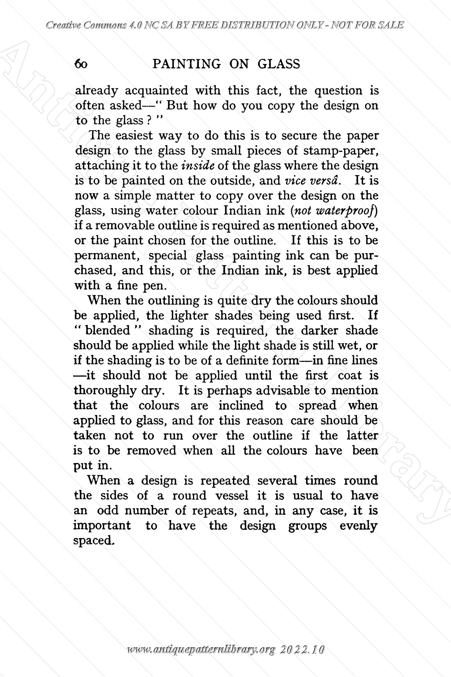 Small hardcover book, 64 numbered pages, and four pages of advertisements at front and back. Last page of list of contents has number v, should be iv. Stencil materials, techniques, some designs. Whitewood painting is similarly described. Barbola work is 3D modeling in a sort of paste, the author gives hints on how to make flowers and leaves. Painting on glass describes painting with enamel and similar paints, not painting with glass paint that has to be fired to be fixed on the glass.