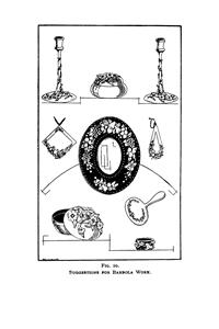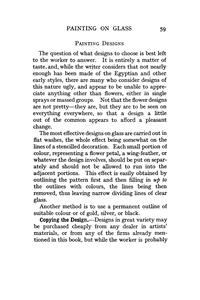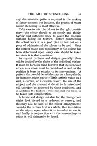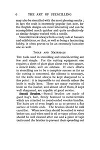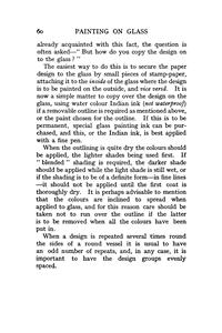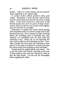 Small hardcover book, 64 numbered pages, and four pages of advertisements at front and back. Last page of list of contents has number v, should be iv. Stencil materials, techniques, some designs. Whitewood painting is similarly described. Barbola work is 3D modeling in a sort of paste, the author gives hints on how to make flowers and leaves. Painting on glass describes painting with enamel and similar paints, not painting with glass paint that has to be fired to be fixed on the glass.