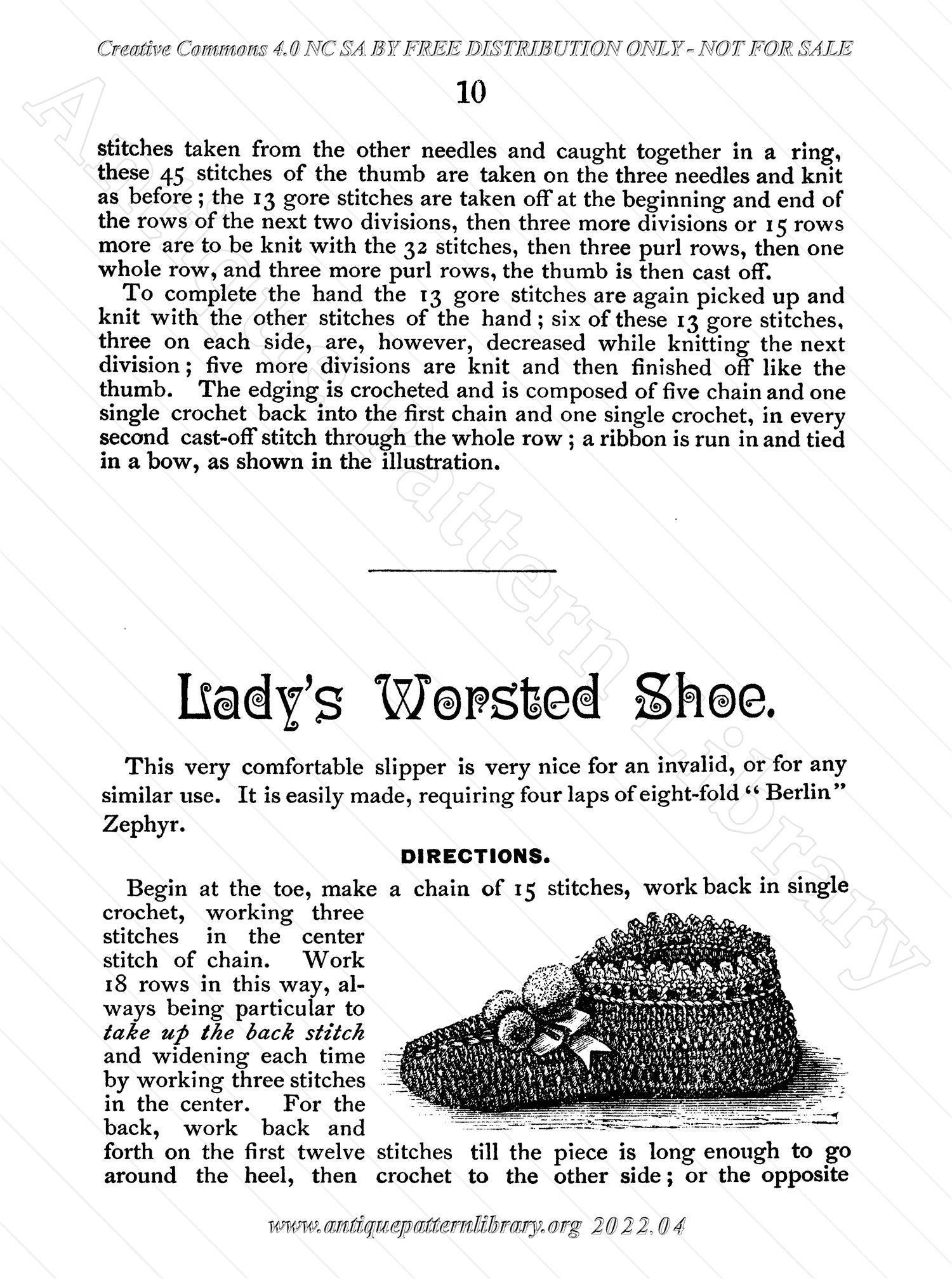 Small book, 8 pages of advertisements , 16 pages of knitting and crochet patterns, followed by another 8 pages of advertisements and example pages of other books. Knitting: Shoulder shawl, Child's knit leggings, Lady's fancy wrister, Lady's mitten, Child's skirt, Infant's Shetland wool vest. Crochet: Boy's crocheted skull cap, Crocheted opera cape or lawn tennis wrap, Child's carriage shell afghan, Lady's worsted shoe, Crochet afghan or carriage blanket.