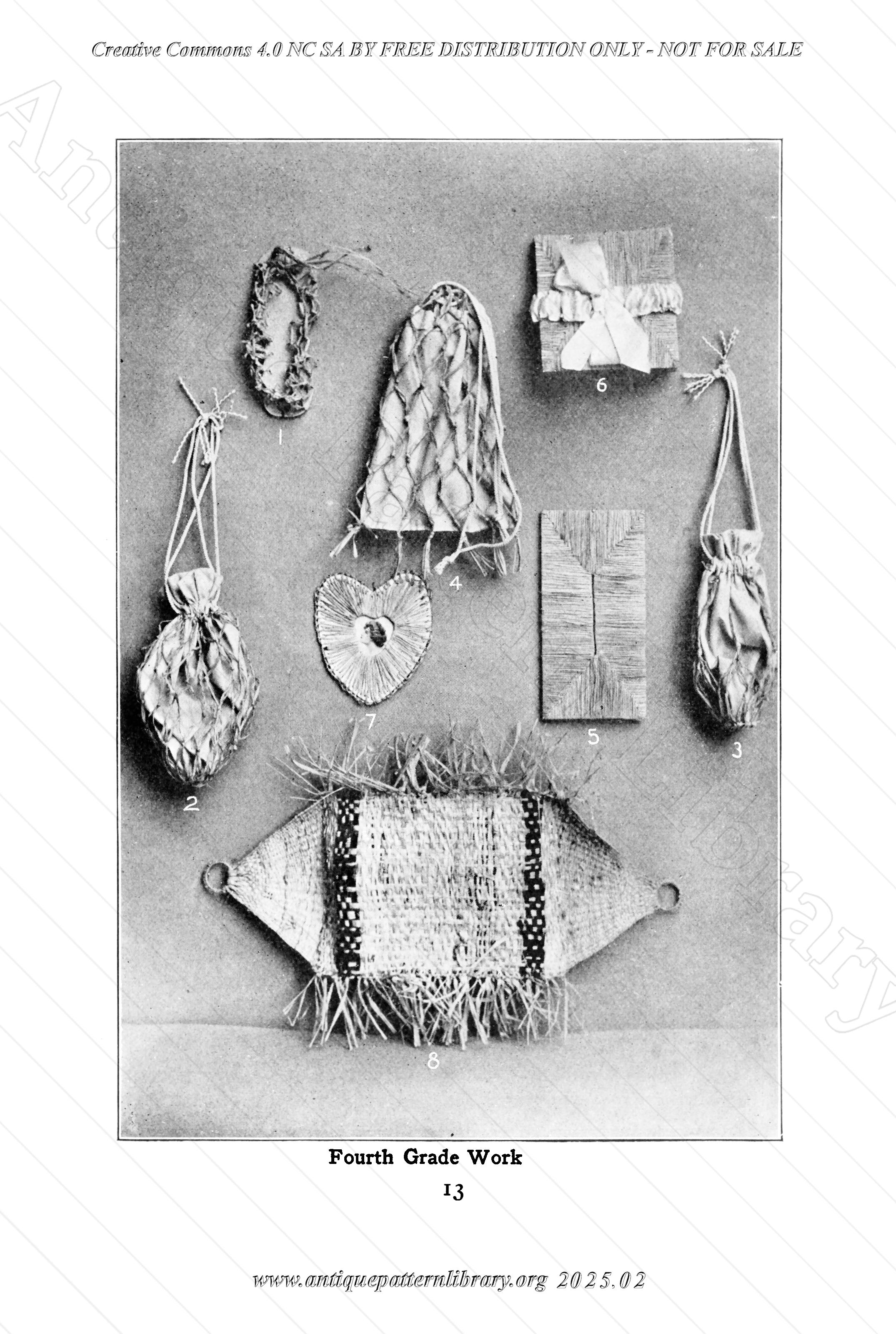 Dated 1914. Lessons from Kindergarten to sixth grade, starting with raffia braiding and ending with reed work. Baskets, doll parasol, card tray, doll hammock, small bags, pin wheel, napkin ring, needlebook and many other small and sometimes useful items. The raffia loom and sewing card for beginners are also illustrated.