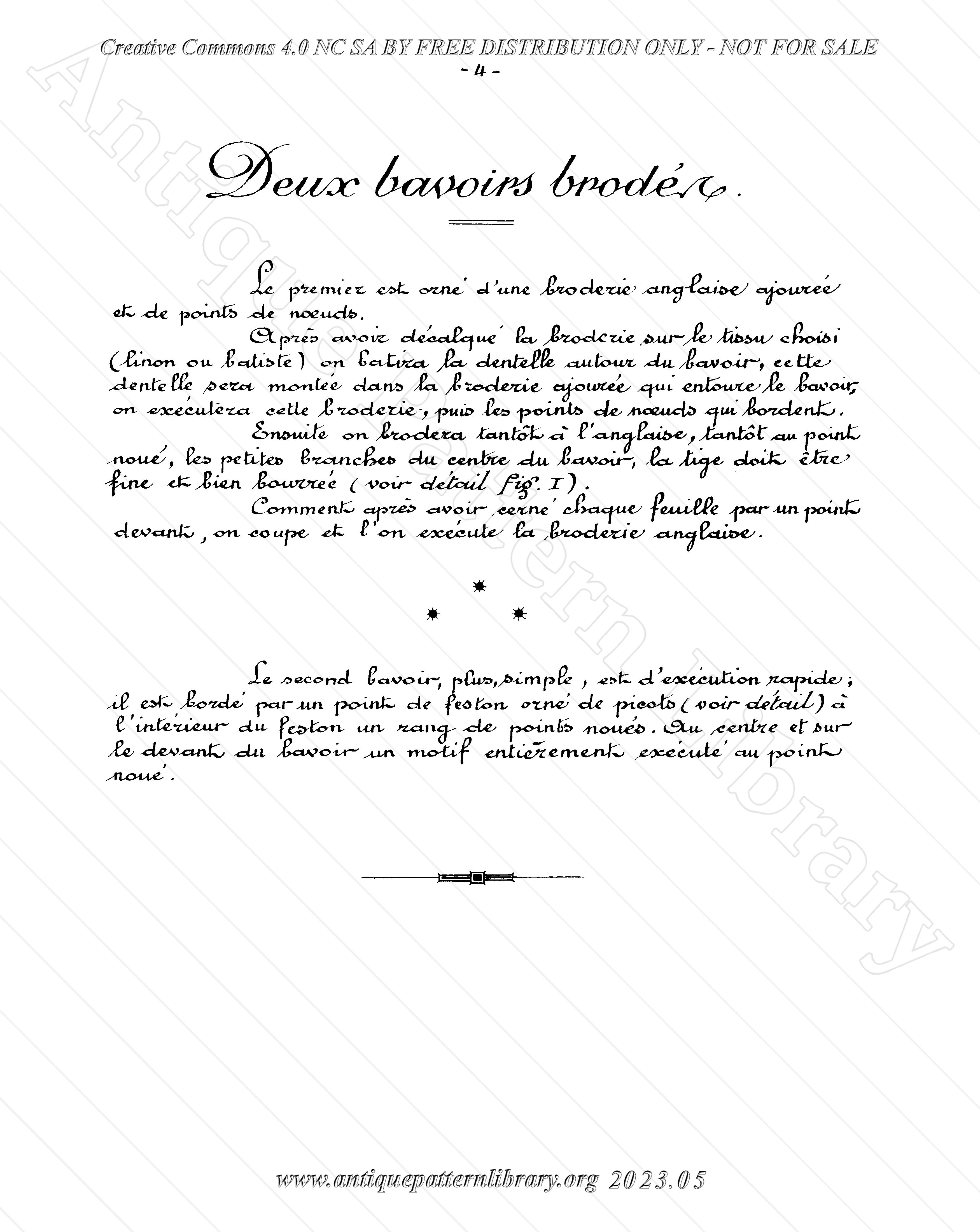 20 pages not including covers. Patterns and explications about the use of knotted stitches in embroidery. Baby items such as baby bibs, baby shoes, baby cap, baptism robe, cradle cover, cradle sheet, cradle pillow cover, toddler aprons, ladies lingerie, collar, embroidered blouses, tea towels and serviettes, pillow cover and sheet. Circa 1926.