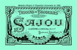 Green Sajou booklet, 16 pages not including covers. Mostly whitework: names, borders, corner designs, two alphabets, two pages of braiding patterns, a page with four simple scattered motifs, and several very complex monograms.