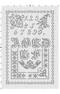 Six patterns in dark and light red shades, borders, corners, two cartouches and some small diamond motifs. The alphabets are in a single shade of blue. Three alphabets interspersed with small motifs of flowers, animals, houses, and people. The red patterns are identical to the (black and grey) patterns in P-II003 Moderne Stickvorlagen No. 752. Some alphabets are identical to other HKB alphabets, but not all.
