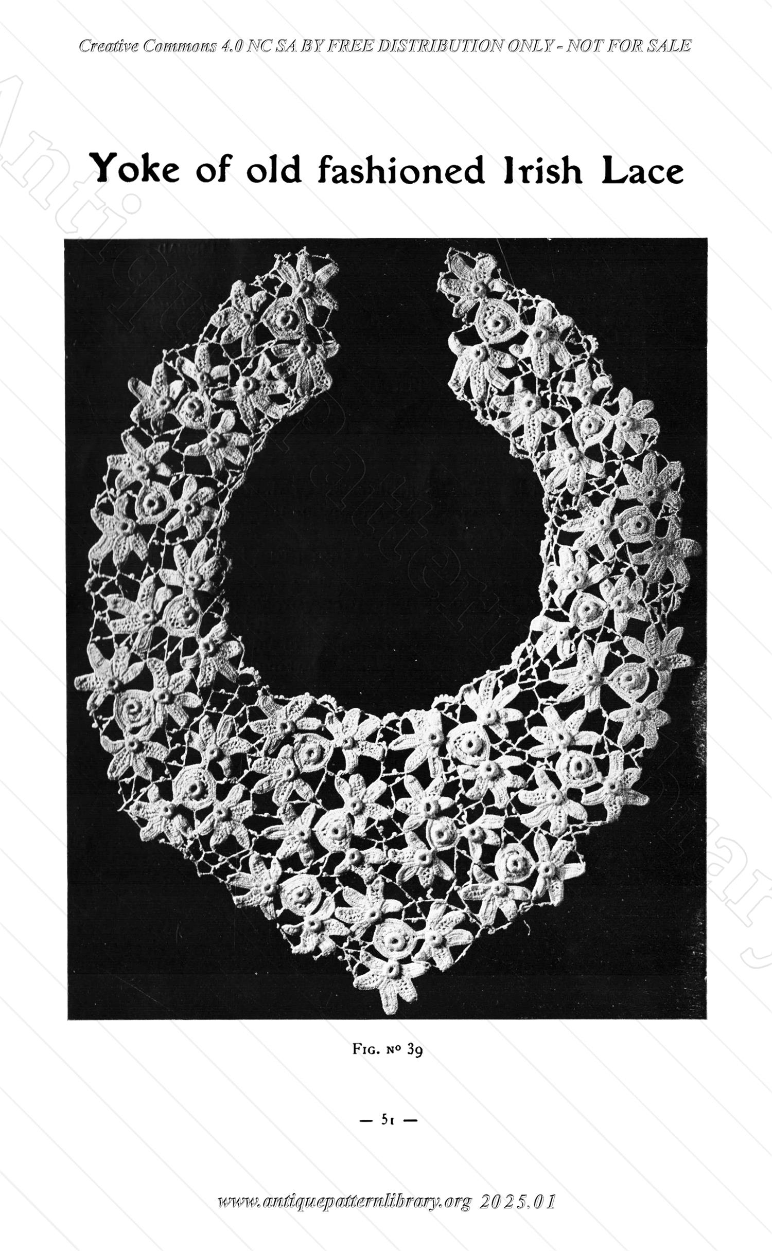 Fine Irish crochet elements, such as picots, small sprigs, sprigs, sprigs, and still more sprigs. After that, lace borders and edgings, with scallops, serpentines, lattices, horseshoe designs, and a narrow edging with small flowers. Insertions, of which one with a very common lattice with an X with a flower at the center, wheels and flowers / stars, a yoke of old fashioned Irish lace, tie ends, a collar, appliques, jabots and a bib. An originally French album that still shows traces of the original language here and there.