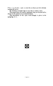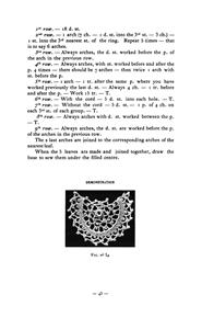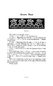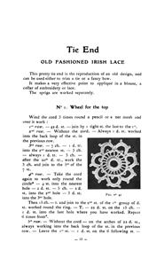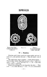 Fine Irish crochet elements, such as picots, small sprigs, sprigs, sprigs, and still more sprigs. After that, lace borders and edgings, with scallops, serpentines, lattices, horseshoe designs, and a narrow edging with small flowers. Insertions, of which one with a very common lattice with an X with a flower at the center, wheels and flowers / stars, a yoke of old fashioned Irish lace, tie ends, a collar, appliques, jabots and a bib. An originally French album that still shows traces of the original language here and there.