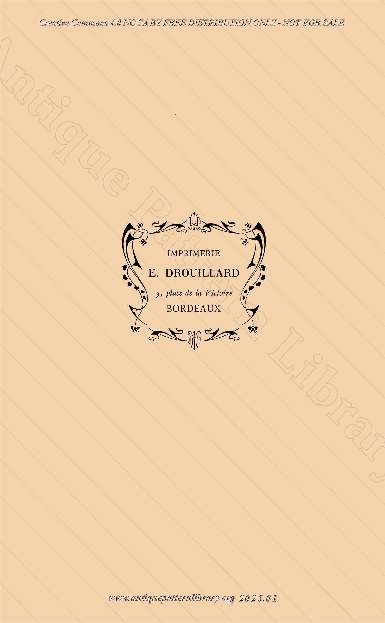 Small booklet teaching how to do hand embroidery using an embroidery frame. Intended for middle school girls in the Gironde department. 8th Edition, 1931. Introduction says 1907. Includes how to fix the fabric on the frame and how to hold the needle. Mostly monogram embroidery, in broderie Anglaise, letters ending in sharp points, interlaced letters, decorated letters, and how to embroider letters consisting of dots. Since it's meant for young girls below high school age, this is about basic techniques.