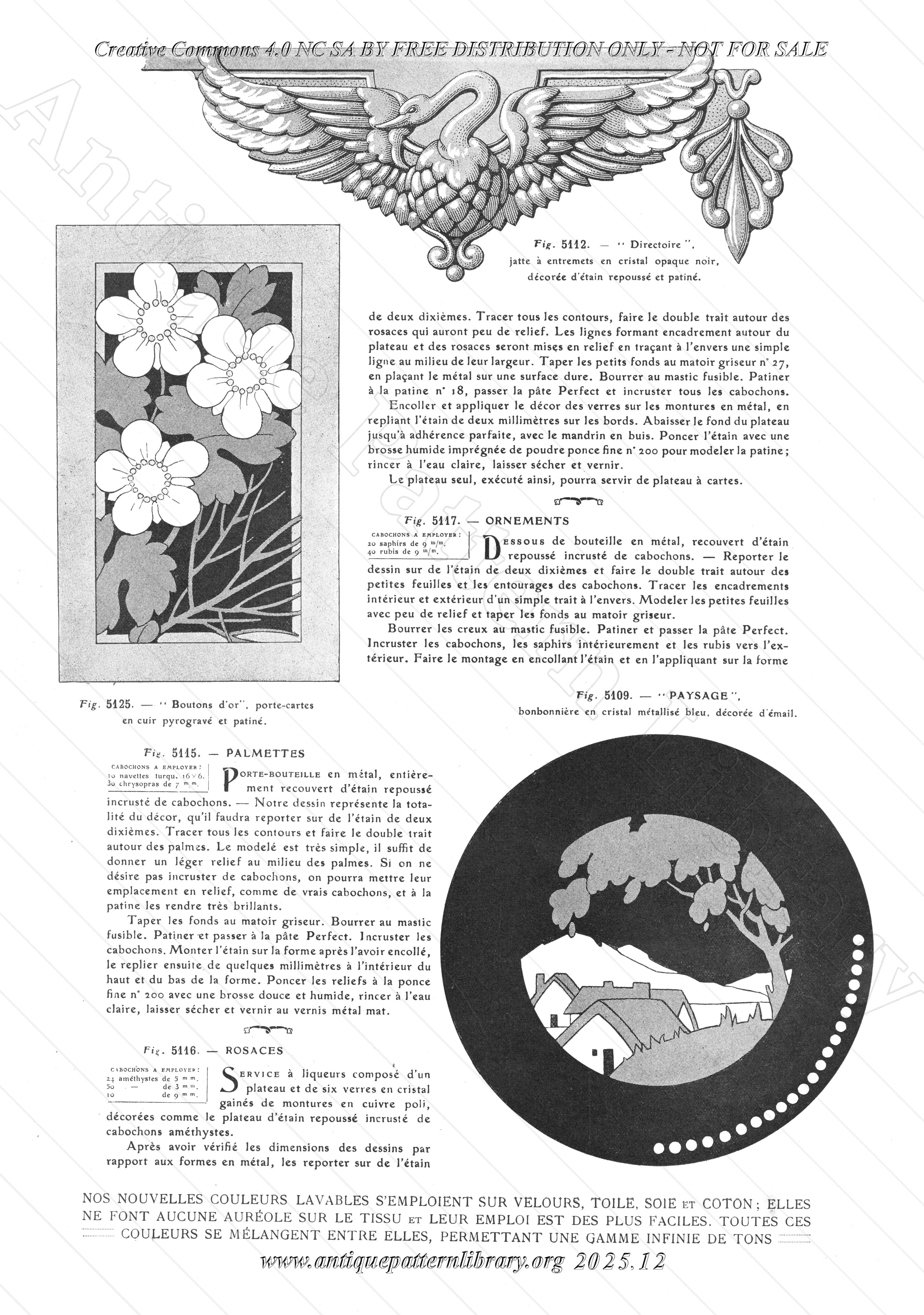 French language magazine of interior design. Includes designs for embroidery, embellishment, repousse on copper (embossing). Style is transitional between Arts & Crafts and Art Deco, and quite dramatic.