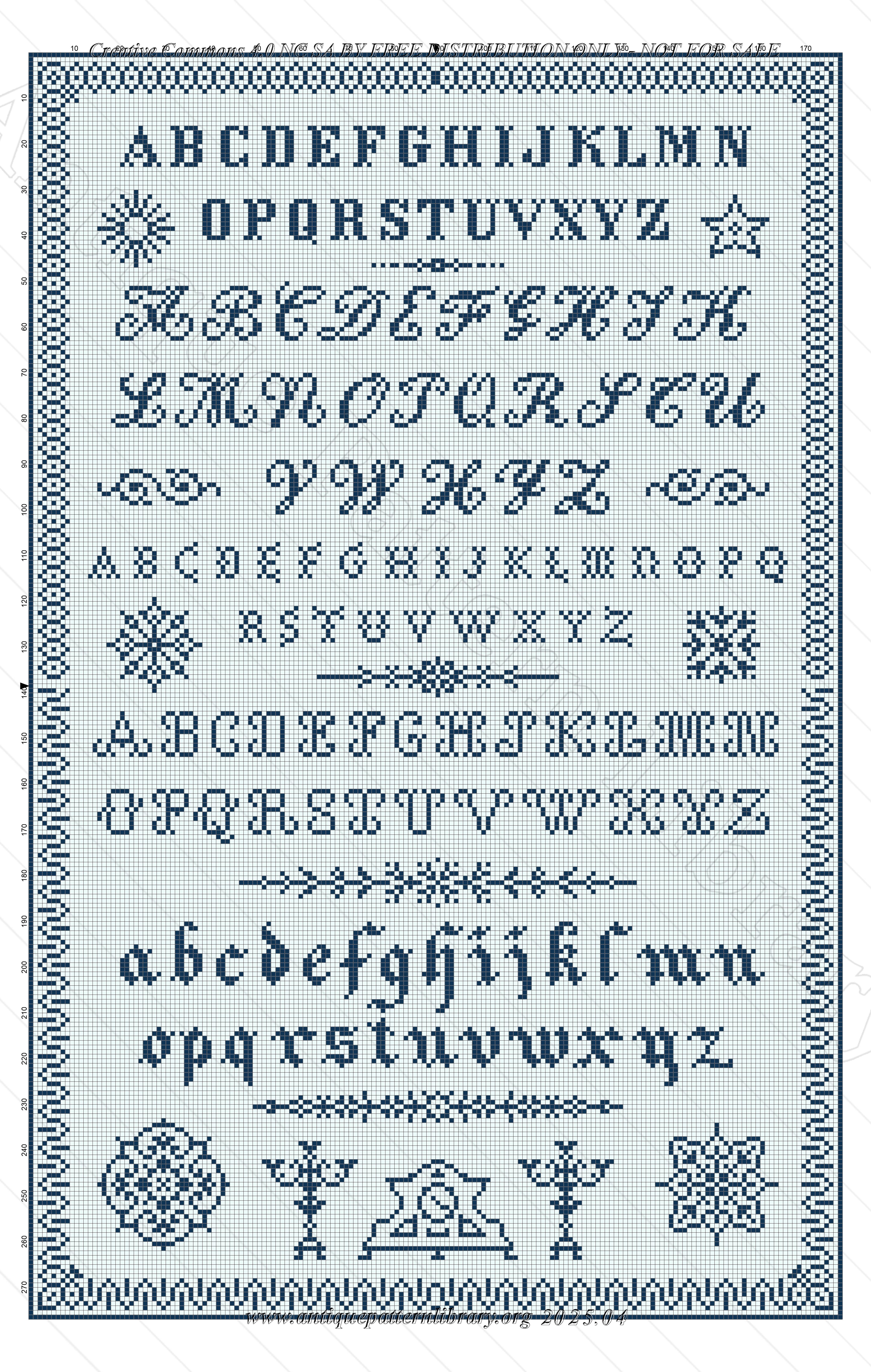 35 alphabets in cross-stitch, from small to quite large, and a medium and large alphabet for whitework or colored embroidery. Also a page with letter combinations and between the alphabets small motifs and mottos.