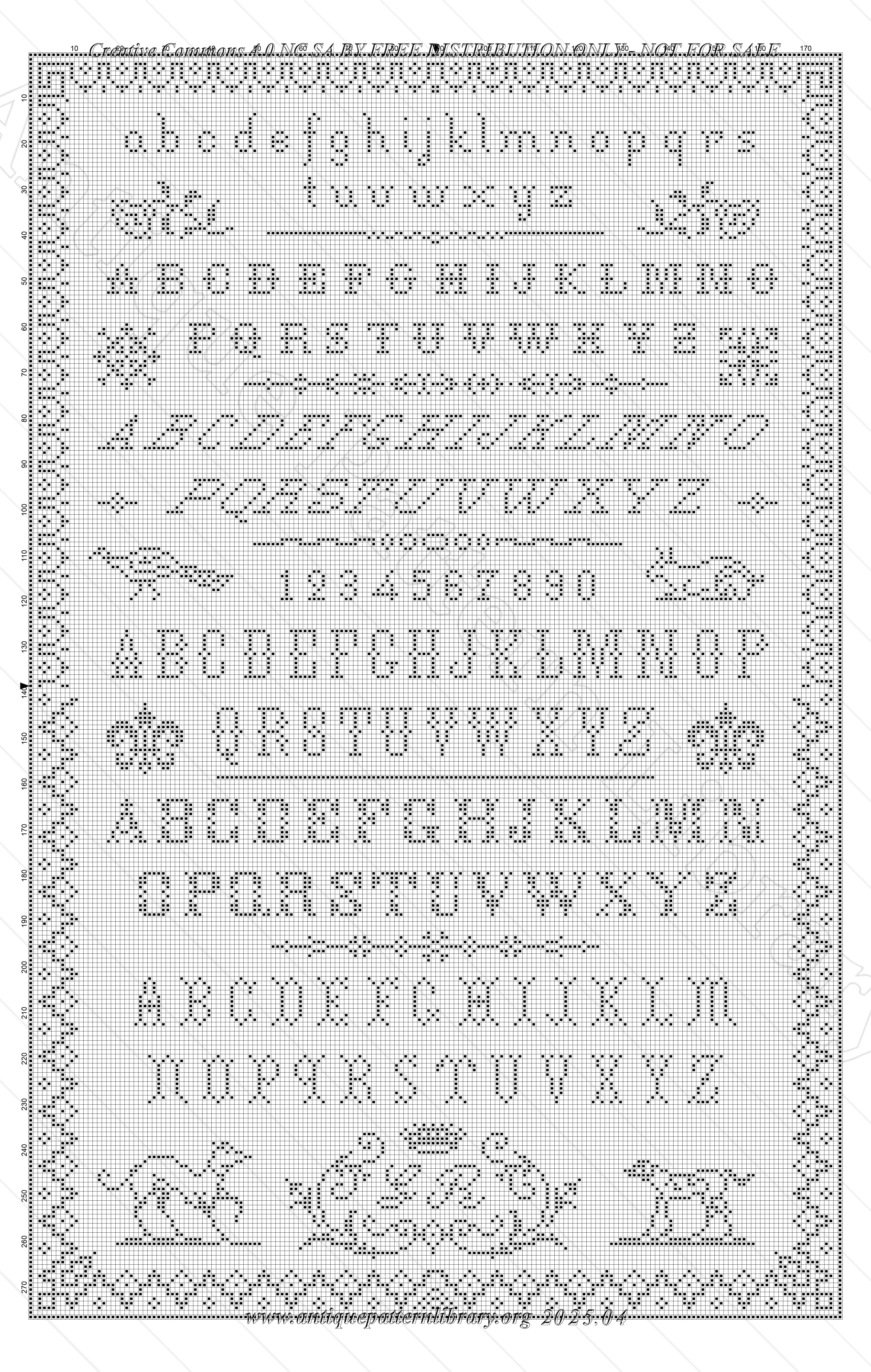 35 alphabets in cross-stitch, from small to quite large, and a medium and large alphabet for whitework or colored embroidery. Also a page with letter combinations and between the alphabets small motifs and mottos.