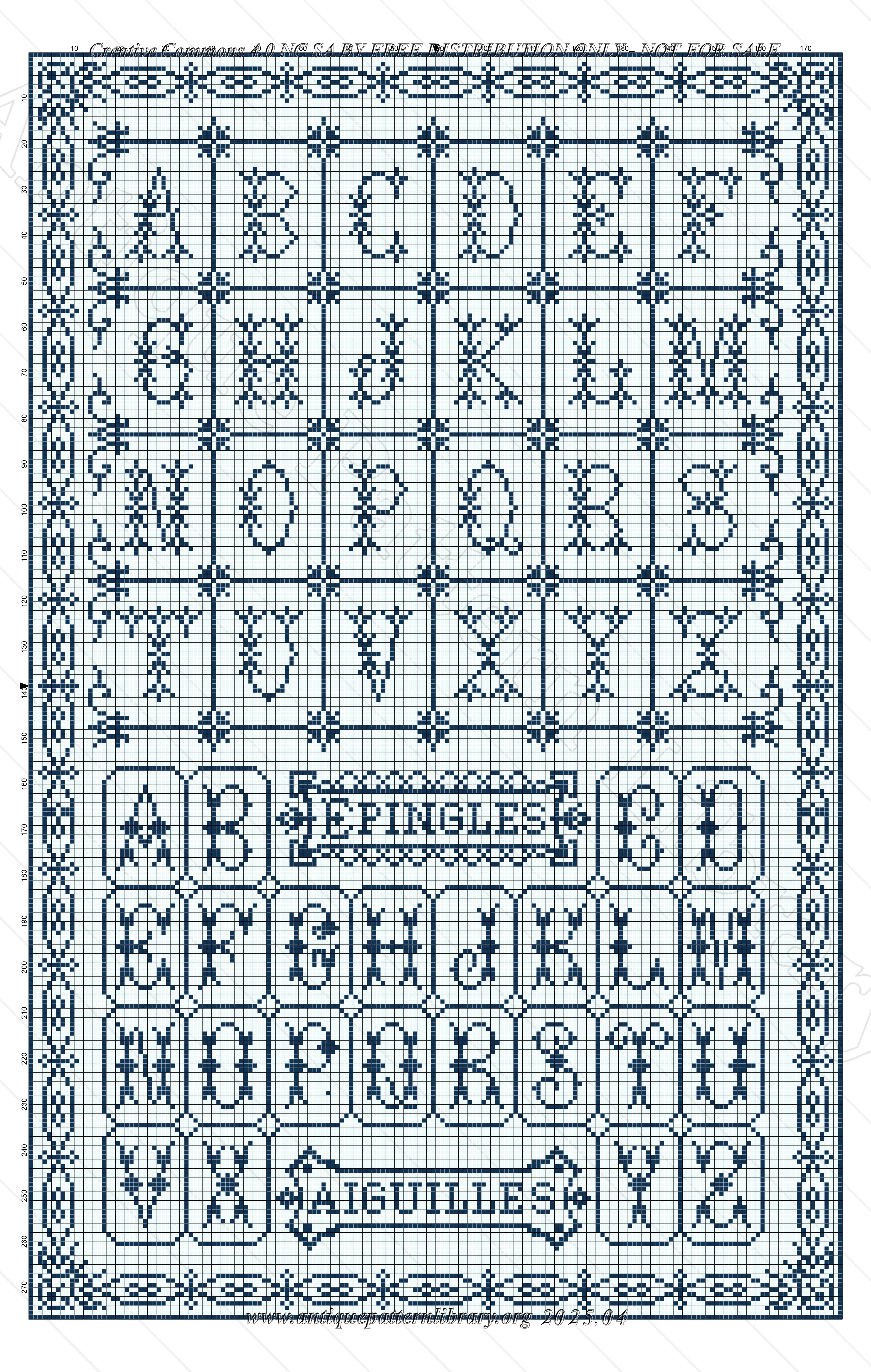 35 alphabets in cross-stitch, from small to quite large, and a medium and large alphabet for whitework or colored embroidery. Also a page with letter combinations and between the alphabets small motifs and mottos.