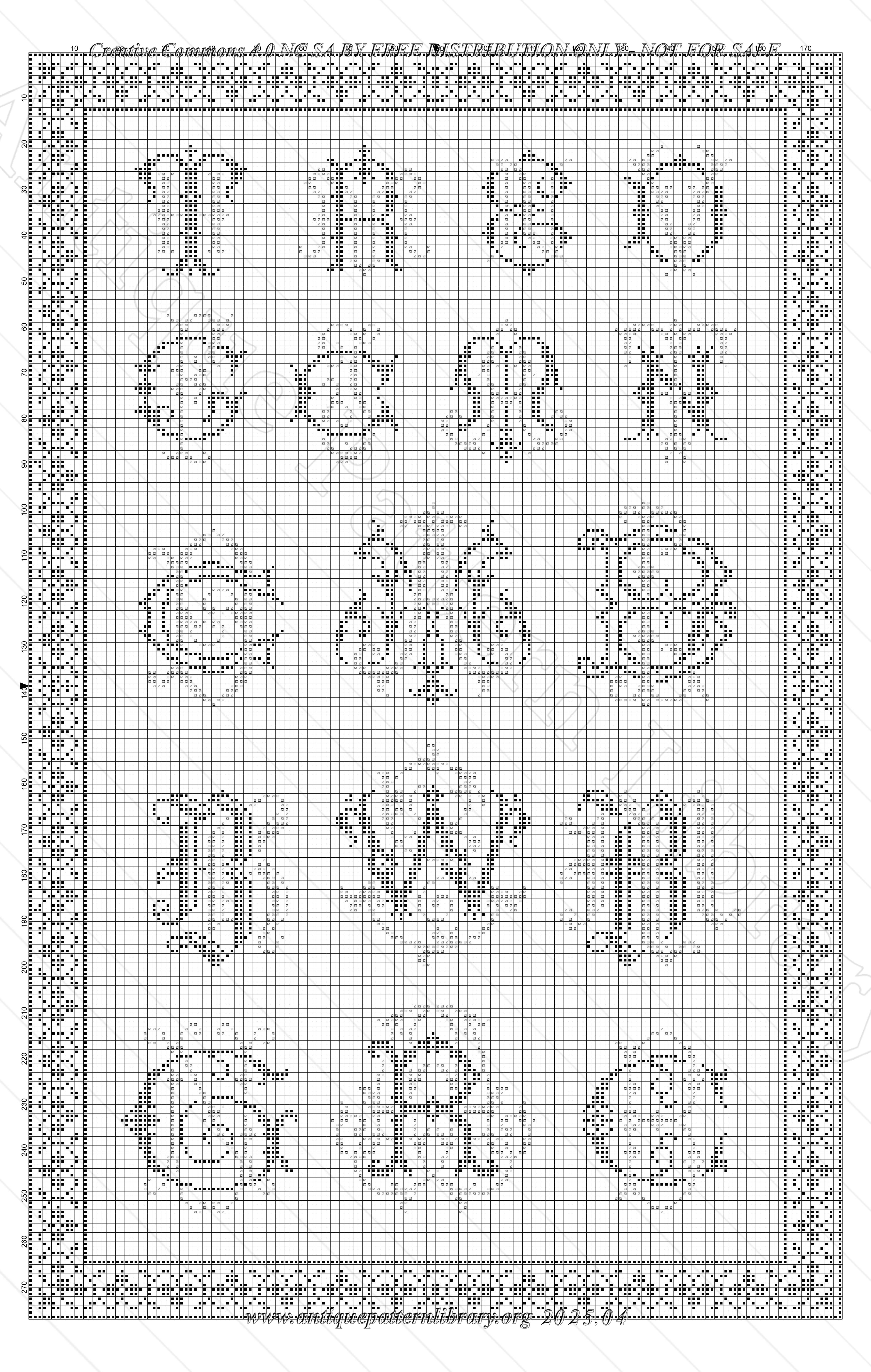 35 alphabets in cross-stitch, from small to quite large, and a medium and large alphabet for whitework or colored embroidery. Also a page with letter combinations and between the alphabets small motifs and mottos.