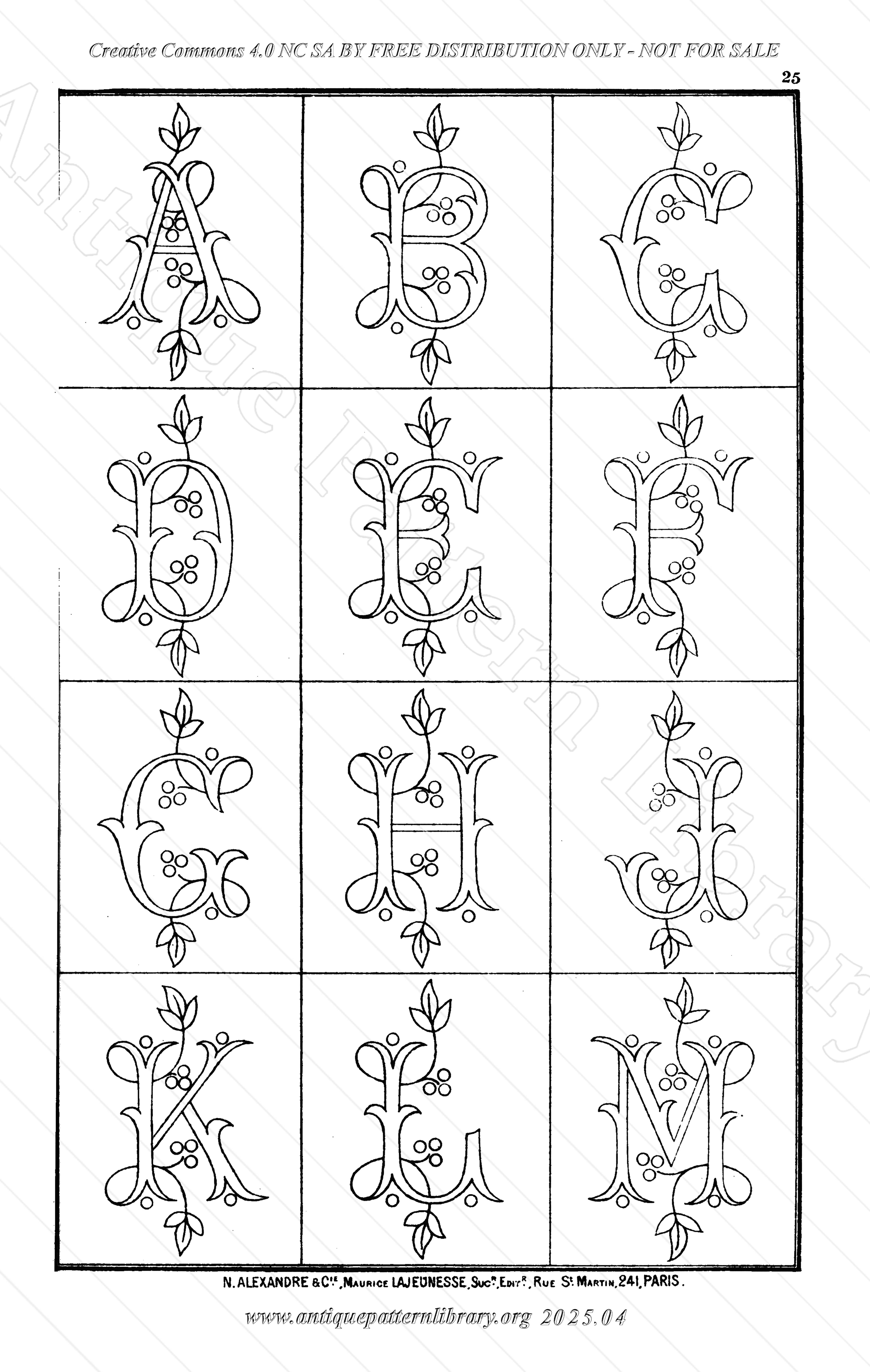 35 alphabets in cross-stitch, from small to quite large, and a medium and large alphabet for whitework or colored embroidery. Also a page with letter combinations and between the alphabets small motifs and mottos.
