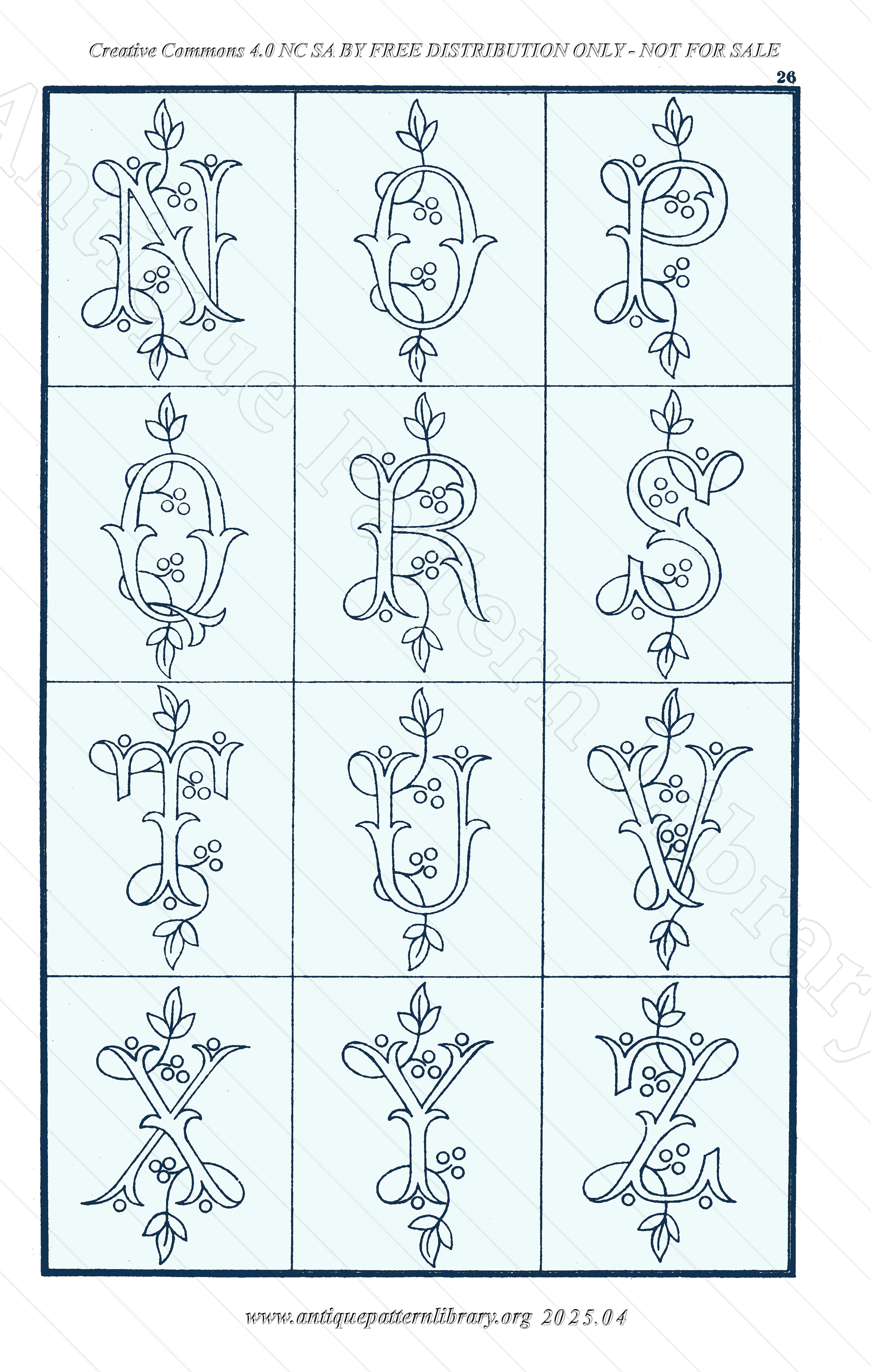 35 alphabets in cross-stitch, from small to quite large, and a medium and large alphabet for whitework or colored embroidery. Also a page with letter combinations and between the alphabets small motifs and mottos.