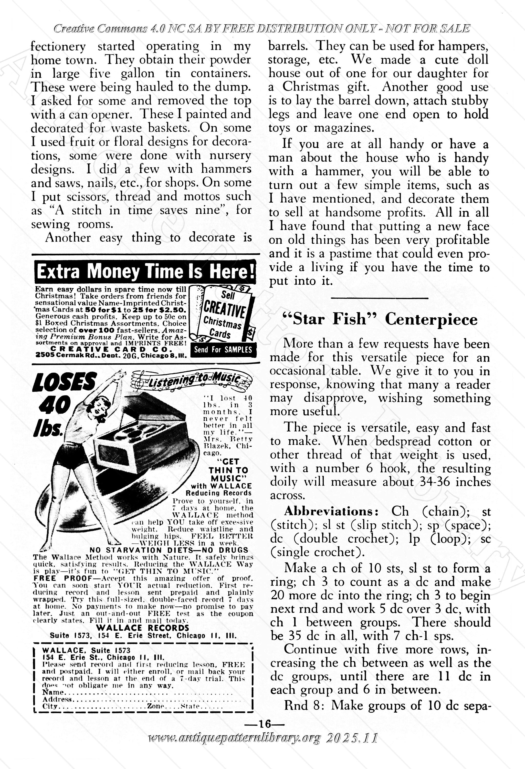 Crochet: Tablecloth with square motifs. Knitting: Knitted Mittens with kitten design on the back, Carriage Robe matching the three-piece baby set in Vol. 15 No. 11. Crochet: Radio Scarf. Painting: New Faces for Old Furnishings, painting motifs on furniture items. Crochet: Star Fish Centerpiece. Women Who Make Cents: Colorizing photographs, sewing stuffed terry cloth toys. Aunt Ellen's Club Notes: Drying Fruits and Vegetables. Crochet: Cochet An Edge for Your Handkerchief. Tatting: Tatted Flower Edge. Cooking: Recipe for Tomato Catsup, Like-Heinz Sweet Pickles, Grandmother's Chili Sauce, Tips for the Pickling Season. Crochet: Matching Sunflower Set of hot plate mat and pan holder. Craft: Shellcraft, making jewelry from shells. Filet Crochet: Crocheted Initials. Painting: Painting Family History on China. Knitting: Knitted Rug. Filet Crochet: Flower Basket Chair Set. Embroidery: School Boy.