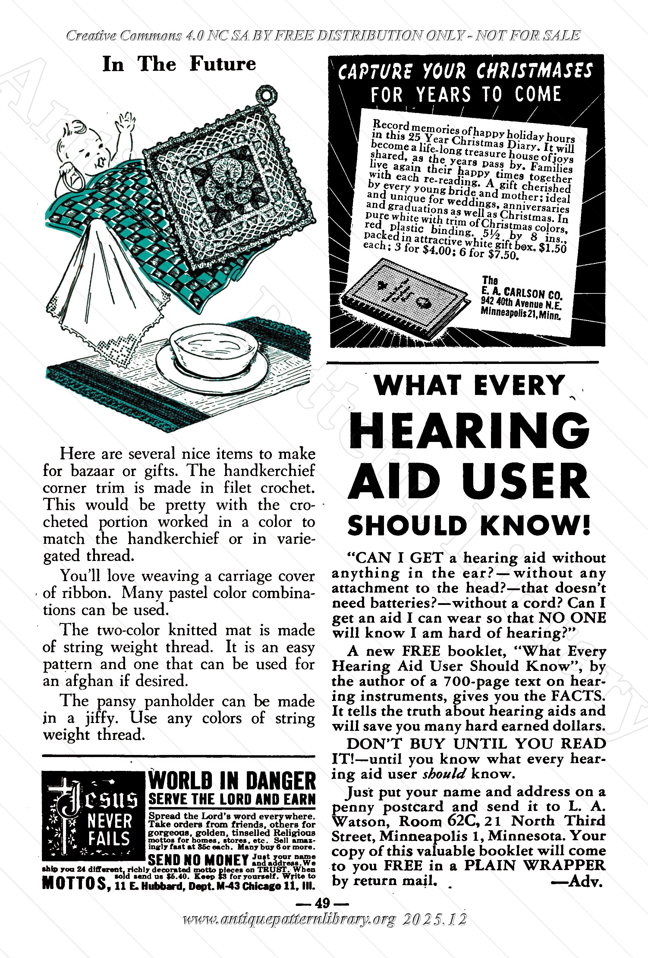 Crochet: Place Mat. Tatting: Tatted Butterfly. Crochet: Crocheted Rug. Selling handmade items. Kn itting: Knitted Doily With Pointed Edge. Sewing: Bitty Bears. Aunt Ellen's Club Notes. Junior Workbasket: making string holder from an old funnel. Cooking: Turkey Roll, Date Gems, Gingerbread Muffins, Orange Cake. Crochet: Pillowcase Insertion, Hot Pan Holder, How to Crochet (with basic crochet stitches). Felt Earrings and matching buttons. Crochet: Leaf Doily. Embroidery: Thanksgiving Miss. Sewing: Stove Pads, Take Pride in Your Darning. Tatting: Yoke or Collar, Combining Two Pieces of Insertion. Crochet: Snowflake Doily, "Varsity" Beanie in Crochet. Cute Lapel Pins of Felt. Crochet: Double Shell Insertion.