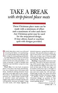 Knitting: Kids' sweaters, patchwork sweater. Crochet: Christmas Tree Skirt. Quilting: Poinsettia Quilt. Embroidery: Easy cross-stitch projects, small charted christmas motifs, cross-stitched table runner. Sewing: calico wreath, Christmas placemats. Crafting: ribbon pinecones, plastic canvas Christmas charm.