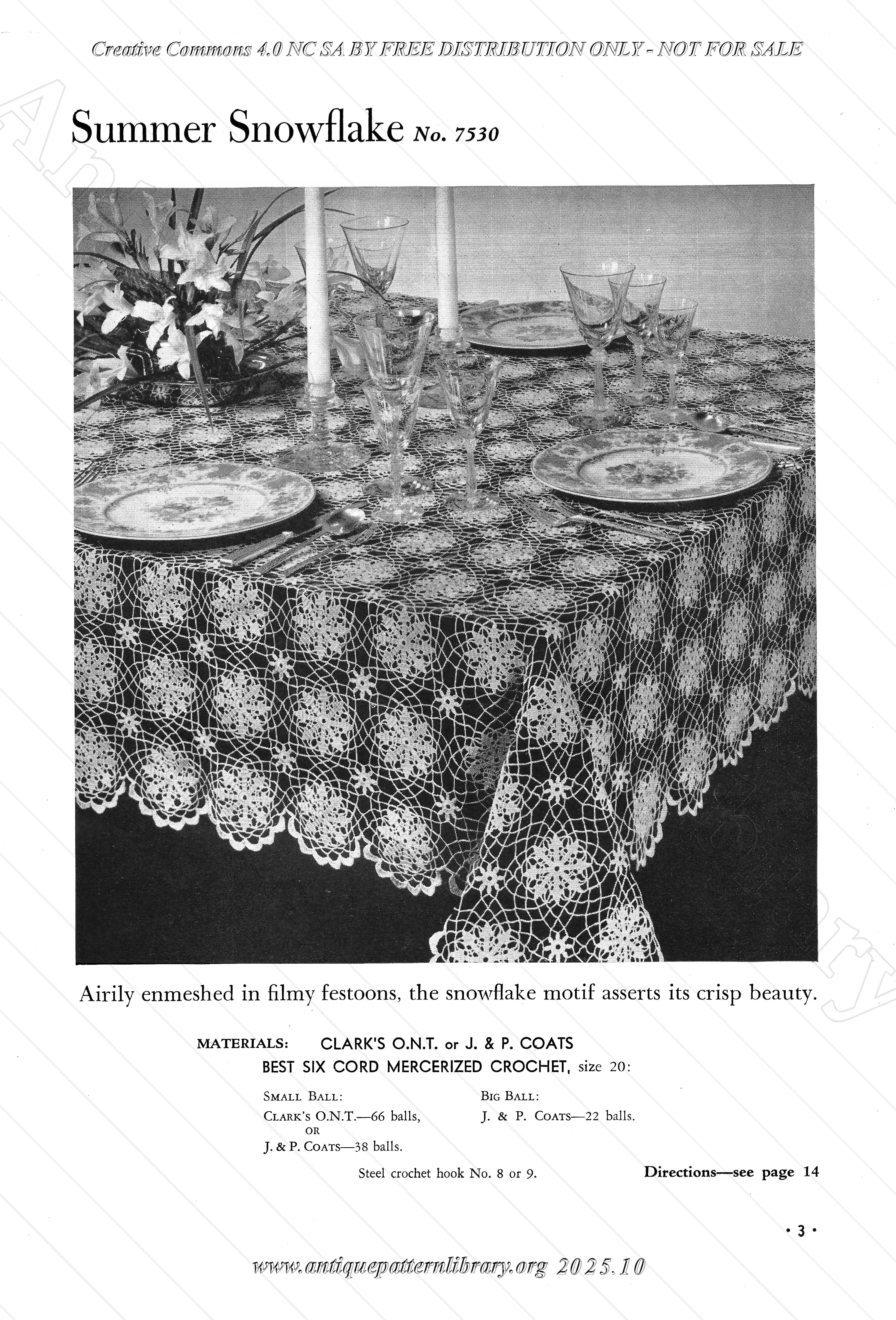 Crocheted tablecloths and other table linens. No. 7530 Summer Snowflake, 7584 Iris Arrangement (filet crochet), 7526 Page Polka Dots, 7533 Sunburst Splendour, 7558 Spinning Wheel, 7588 Spring Fantasy, 7554 Good Companions (tiny doilies), 7587 Country Cousin (luncheon set), 7486 Memory Lane (Irish Crochet), 7592 Salute to the Pineapple, 7592-M Presto, 7591 Flower Fable, 7531 Today's Heritage (filet crochet), 7525 Four Leaf Clover, 7485 Early American, 7586 At Your Service! (tray cloth), 7529 Trailing Vine (filet crochet), 7585 Lady Bountiful, 7583 Martha Washington.