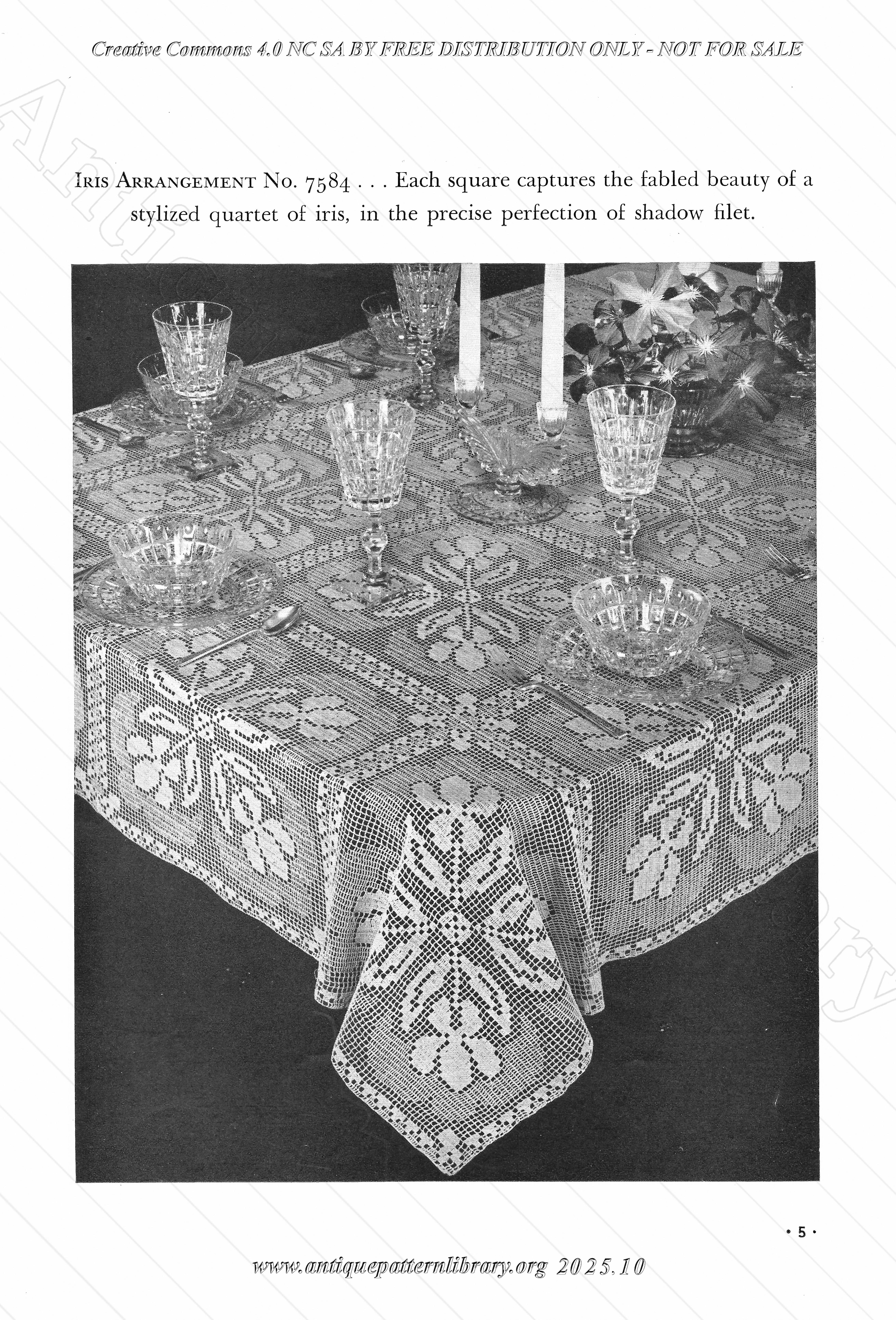Crocheted tablecloths and other table linens. No. 7530 Summer Snowflake, 7584 Iris Arrangement (filet crochet), 7526 Page Polka Dots, 7533 Sunburst Splendour, 7558 Spinning Wheel, 7588 Spring Fantasy, 7554 Good Companions (tiny doilies), 7587 Country Cousin (luncheon set), 7486 Memory Lane (Irish Crochet), 7592 Salute to the Pineapple, 7592-M Presto, 7591 Flower Fable, 7531 Today's Heritage (filet crochet), 7525 Four Leaf Clover, 7485 Early American, 7586 At Your Service! (tray cloth), 7529 Trailing Vine (filet crochet), 7585 Lady Bountiful, 7583 Martha Washington.