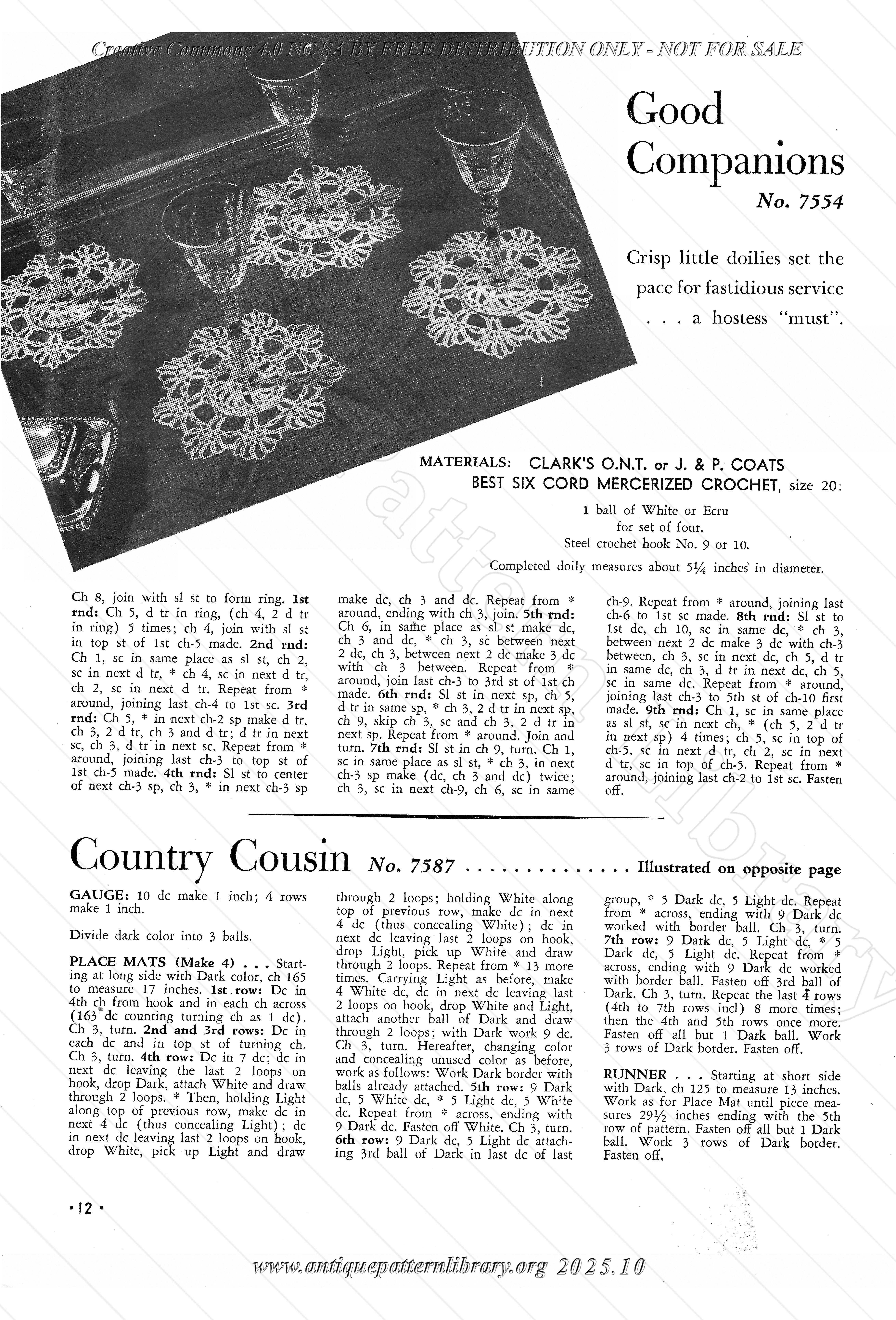 Crocheted tablecloths and other table linens. No. 7530 Summer Snowflake, 7584 Iris Arrangement (filet crochet), 7526 Page Polka Dots, 7533 Sunburst Splendour, 7558 Spinning Wheel, 7588 Spring Fantasy, 7554 Good Companions (tiny doilies), 7587 Country Cousin (luncheon set), 7486 Memory Lane (Irish Crochet), 7592 Salute to the Pineapple, 7592-M Presto, 7591 Flower Fable, 7531 Today's Heritage (filet crochet), 7525 Four Leaf Clover, 7485 Early American, 7586 At Your Service! (tray cloth), 7529 Trailing Vine (filet crochet), 7585 Lady Bountiful, 7583 Martha Washington.