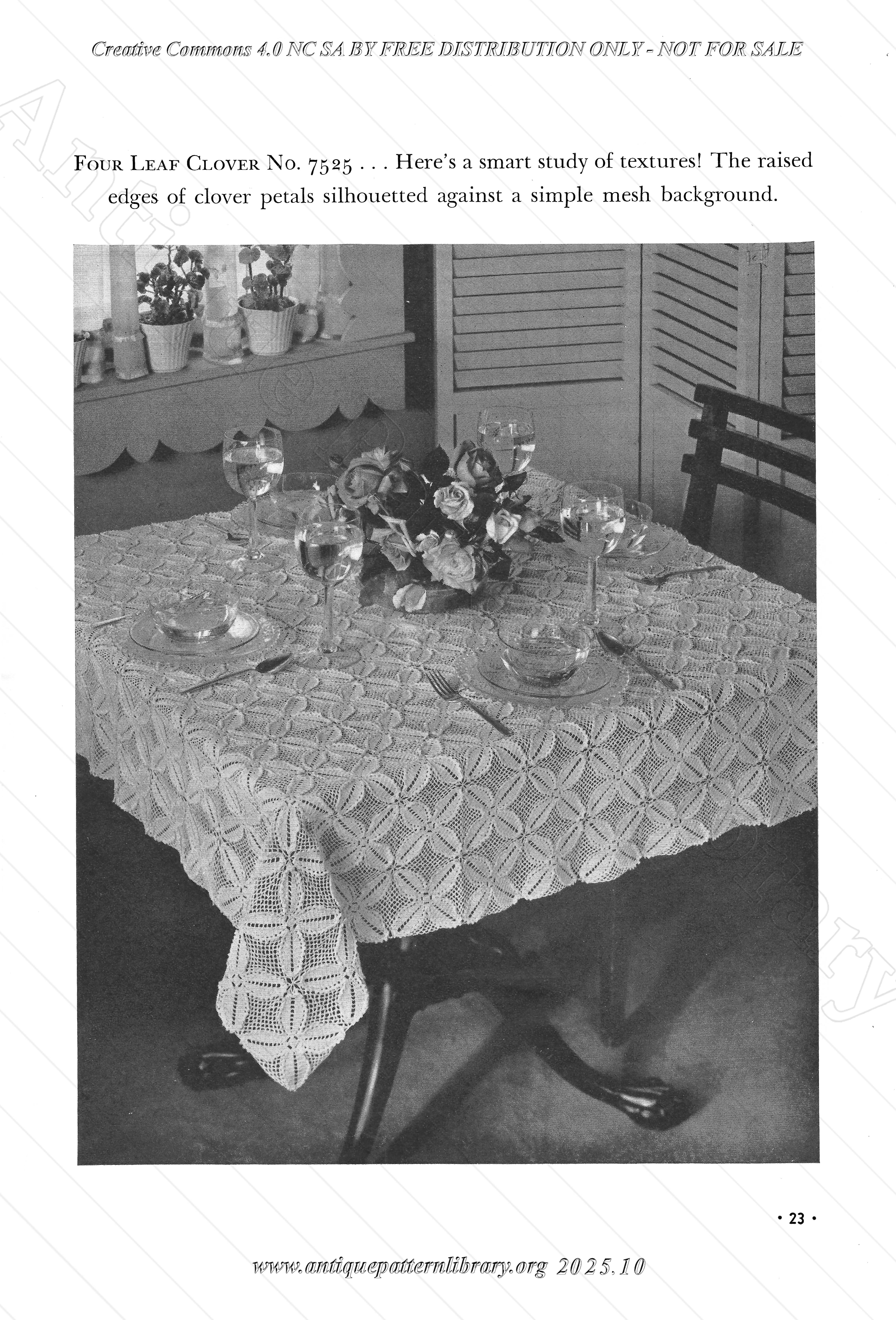 Crocheted tablecloths and other table linens. No. 7530 Summer Snowflake, 7584 Iris Arrangement (filet crochet), 7526 Page Polka Dots, 7533 Sunburst Splendour, 7558 Spinning Wheel, 7588 Spring Fantasy, 7554 Good Companions (tiny doilies), 7587 Country Cousin (luncheon set), 7486 Memory Lane (Irish Crochet), 7592 Salute to the Pineapple, 7592-M Presto, 7591 Flower Fable, 7531 Today's Heritage (filet crochet), 7525 Four Leaf Clover, 7485 Early American, 7586 At Your Service! (tray cloth), 7529 Trailing Vine (filet crochet), 7585 Lady Bountiful, 7583 Martha Washington.