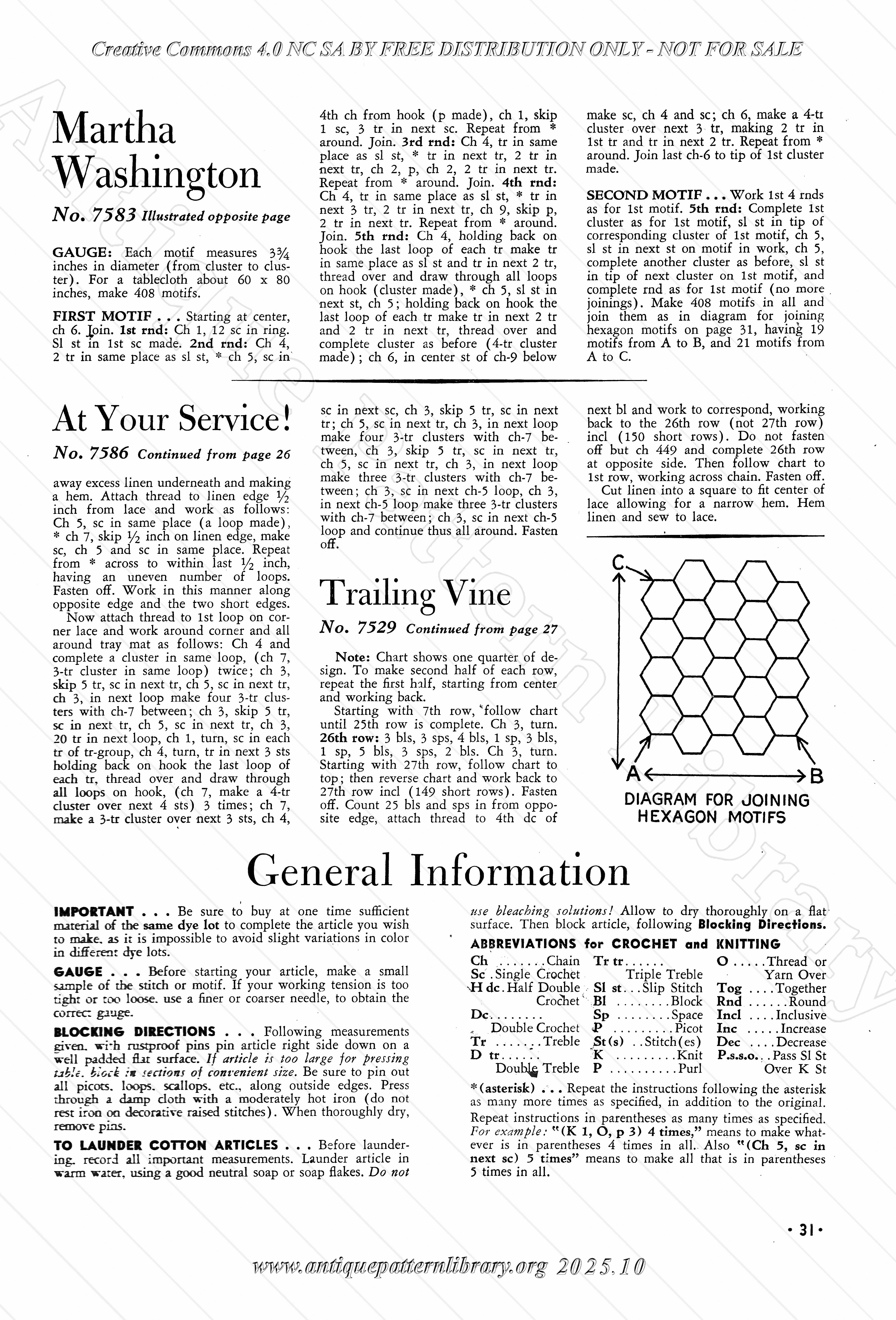 Crocheted tablecloths and other table linens. No. 7530 Summer Snowflake, 7584 Iris Arrangement (filet crochet), 7526 Page Polka Dots, 7533 Sunburst Splendour, 7558 Spinning Wheel, 7588 Spring Fantasy, 7554 Good Companions (tiny doilies), 7587 Country Cousin (luncheon set), 7486 Memory Lane (Irish Crochet), 7592 Salute to the Pineapple, 7592-M Presto, 7591 Flower Fable, 7531 Today's Heritage (filet crochet), 7525 Four Leaf Clover, 7485 Early American, 7586 At Your Service! (tray cloth), 7529 Trailing Vine (filet crochet), 7585 Lady Bountiful, 7583 Martha Washington.